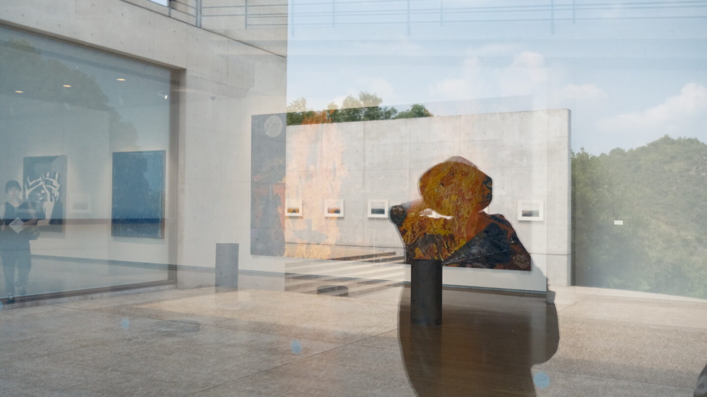 美術館の外から中を見たときにガラスの反射や映り込みが重なり、何気ない風景が不思議な光景に変わりました。閃きのまま絵画とシルエットを重ねてみたらアートのようなオシャレ感です。