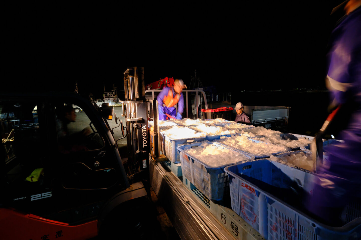 フォークリフトで運ばれてきた氷を次々に漁船に搬入しました。漁船の淡い光やそれに映し出される氷の質感、男たちの「静」と「動」もX-H2は細部を繊細に捉えて高画質な写真に仕上げてくれます。