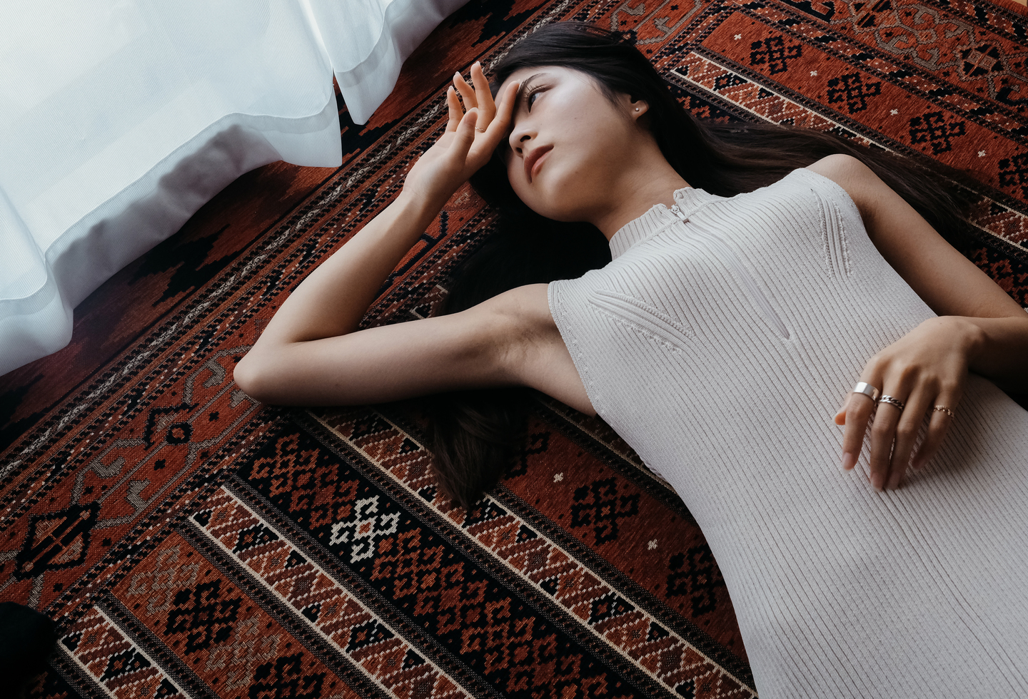 ポートレート撮影において瞳にピントを合わせることは重要です。さらに言えば、ピントを合わせる瞳は手前側が原則です。なぜなら、日常生活の中で横向きの人の目を見るとき、最初に見る部分は自然と手前側になるからです。奥側の目を見る人は少数、またはほぼいないでしょう。よって、奥側の瞳にピントが合っていると違和感が生まれるので、必ず手前側の瞳にピントを合わせます。