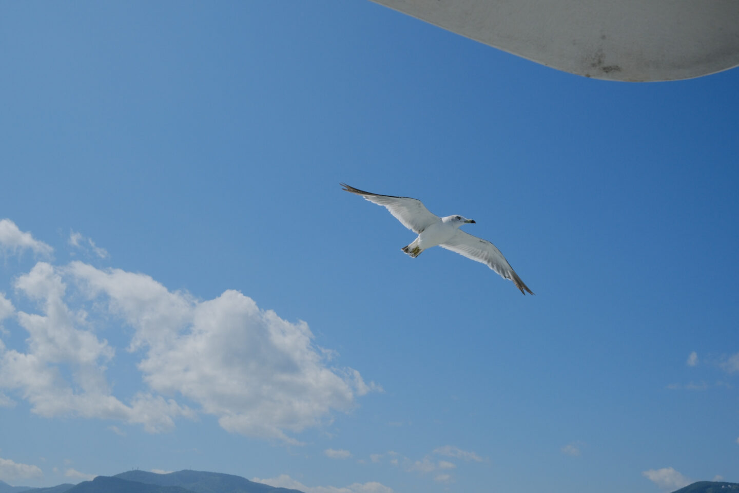 ライフジャケットを着たらデッキでも撮影できるよ、と乗務員さん。それでは、ライフジャケットをお借りしますと話していると、カモメがやってきた。