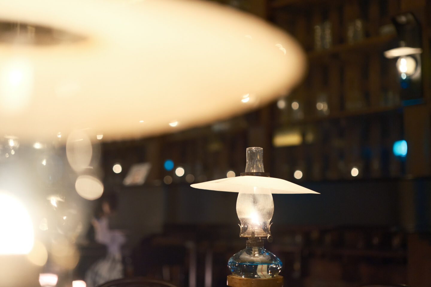 F1.6で手前のランプにぐっと寄って前ボケにする。壁際のランプが玉ボケになり、暗い背景のアクセントに。ランプの灯りの暖かい雰囲気をぎゅっと閉じ込める。