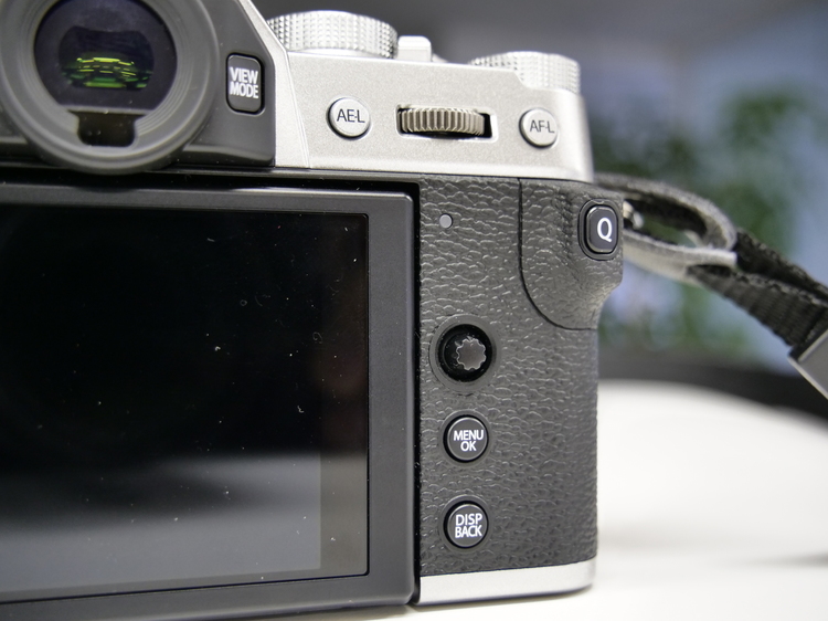 唯一、各種メニューの変更を行うQボタンが親指グリップ位置に。実際に操作した印象として、ファインダーを覗いたまま直感的にメニュー操作ができるように設計されているように感じました。カスタムメニューとしてフィルムシミュレーションを割り当てておけば、便利ですよね。