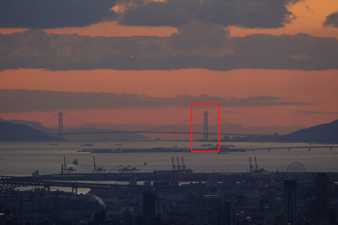 これは私の地元の生駒山から明石大橋を撮影したものです。撮影場所から橋までは約60kmあり、レンズはXF100-400mmF4.5-5.6 R LM OIS WRを使い、絞りはF8で撮影しています。