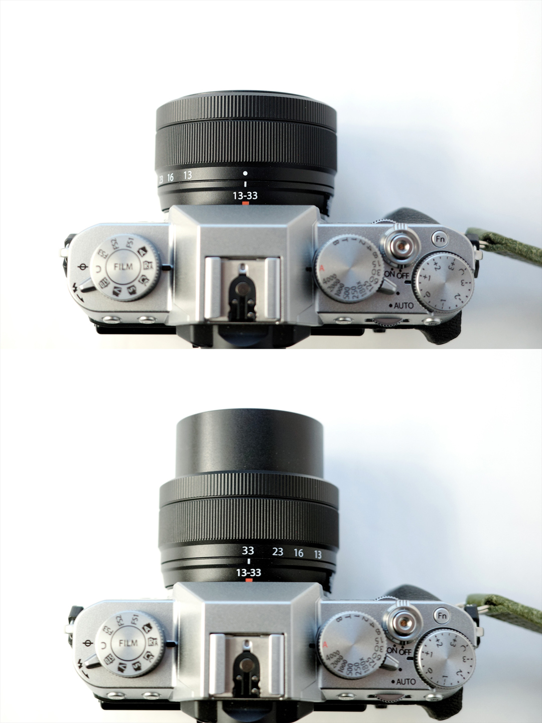 MF用のフォーカスリングは備わっていますが、絞りリングは非搭載です。X-T30 IIIではボディ側のフロントコマンドダイヤルで「F⇔ISO」の切り替え、F値の変更を行います。