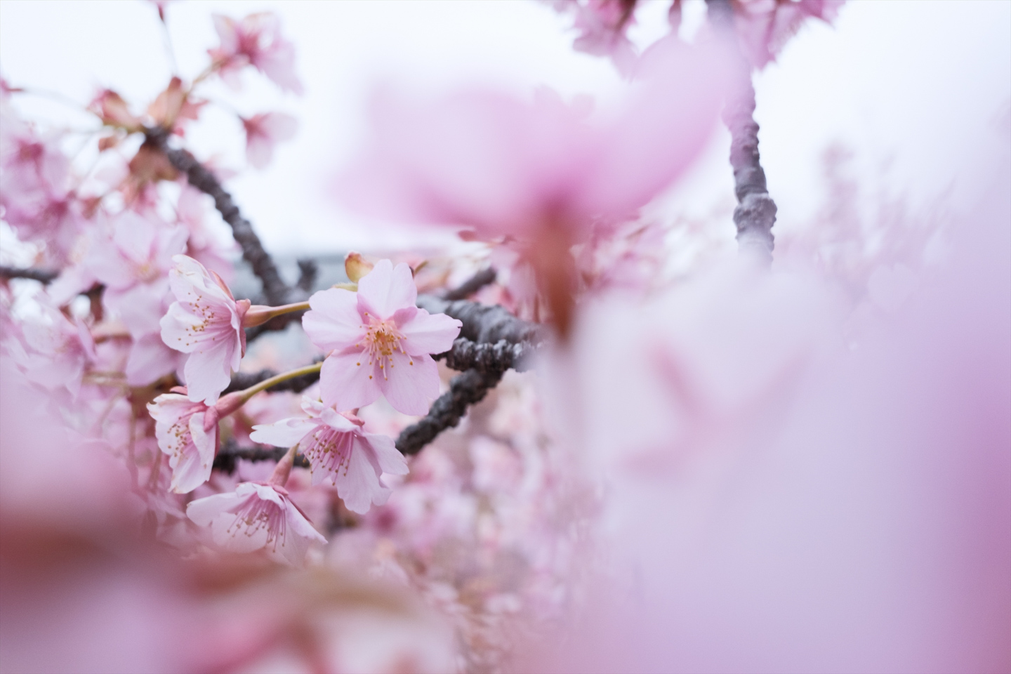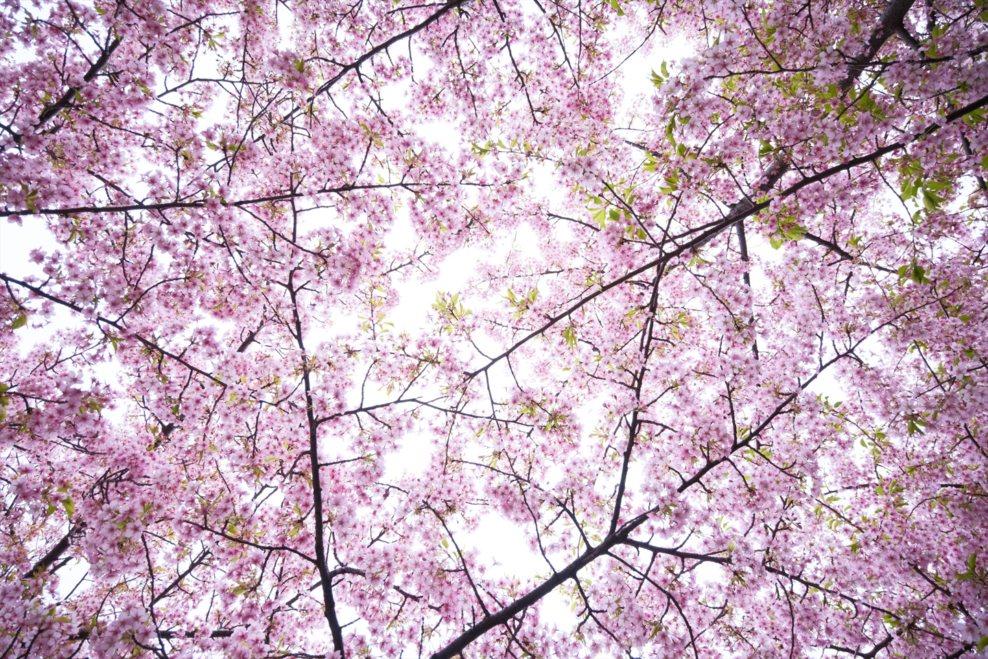 終わりかけの河津桜を真下から見上げてみました。一面に春らしい色が広がるこの構図は、13mmでないと叶いませんね。