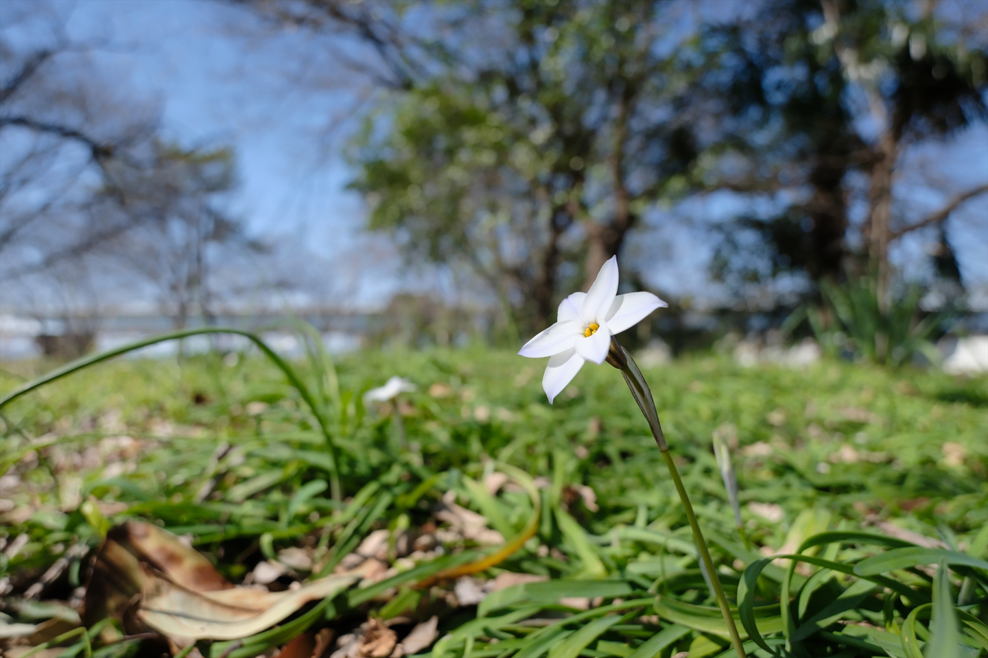 一輪のハナニラを見つけ、地面ギリギリでの撮影。X-T30 IIIはチルトモニターなので助かりました。