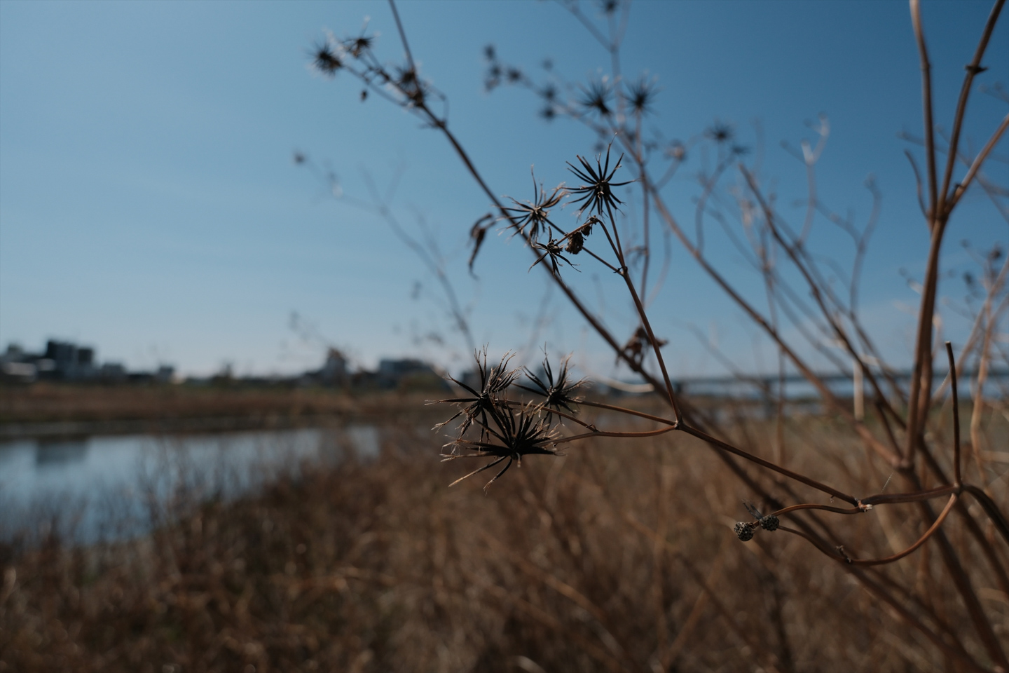 ピント面のシャープな描写が際立ちます。川辺の枯草と水面が写り込んだ様子も取り入れてフレーミングしてみました。