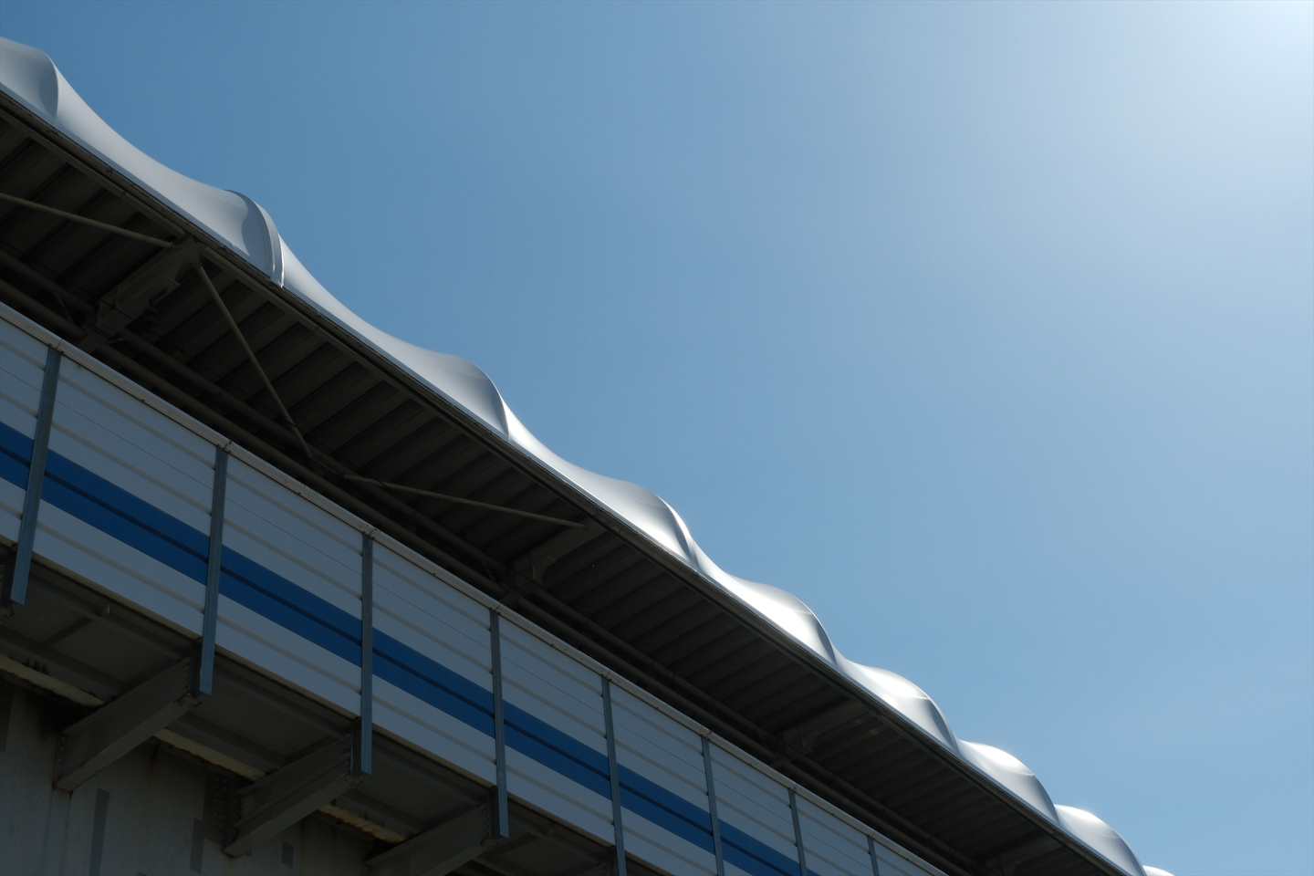 強い光を受けた駅舎の屋根。コントラストの高いシーンですが、滑らかなツヤ感と、波打つ形を美しく引き出しました。シャドー部もしっかりと細やかに写し込んでいます。