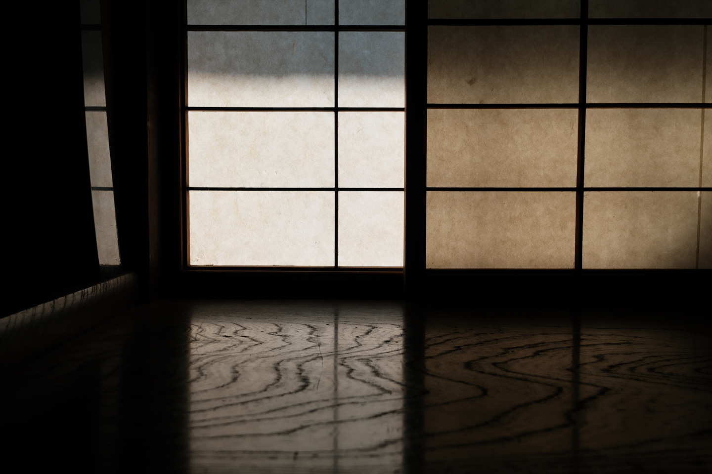 障子越しの光で透ける和紙の繊維、光を受けた板の木目と傷までかなり細部にわたる繊細な描写。しっとりとした雰囲気も写し込んでいます。