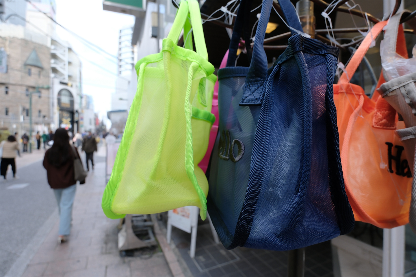 セレクトショップの店先に小ぶりなバッグがディスプレイされていました。カラフルな色合いが明るい季節の到来を待っているよう。街の様子とともに広角レンズらしい一枚を。