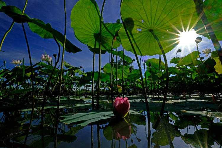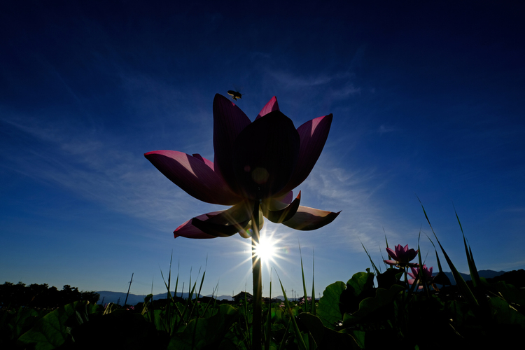 四季折々の花が咲くことで知られている藤原京跡。もともとは日本で初めての本格的な都が造成された地です。夏には蓮が咲き誇ります。太陽の光条を出すためにF20に絞って撮影していると、偶然飛んできた蜂がワンポイントのアクセントになりました。