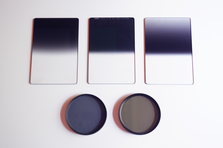 私が普段よく使うフィルターです。上段は角型のハーフNDフィルターで半分だけに減光効果があります。左からソフト(グラデーションがゆるやか)、ハード(グラデーションがはっきりしている)、リバース(上部にいくほどND効果が薄くなる)などのタイプをシーンにより使い分けしています。また、水面の反射や空の青みを増すためのPLフィルター(左下)、滝などの撮影に重宝する可変式のNDフィルター(右下)をよく使います。