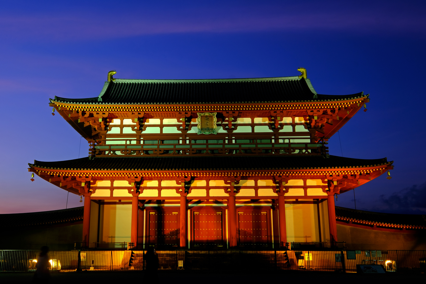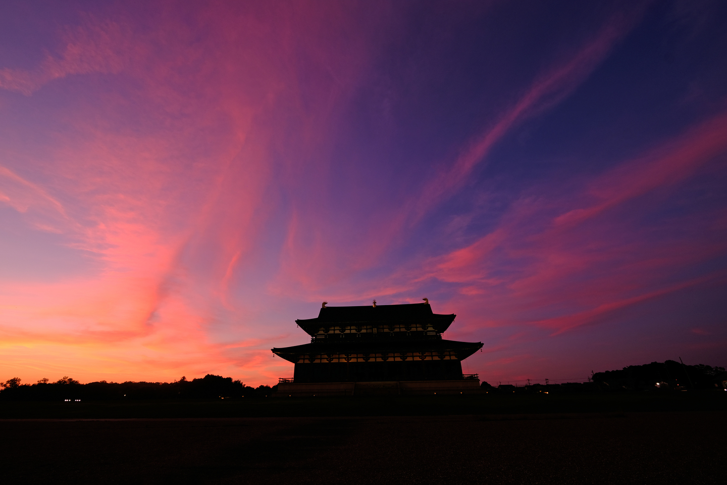 まずは地元奈良の世界遺産である平城京の大極殿です。家から車で30分程度なのでよく行く場所なのですが、梅雨時期の天気の安定しない時期には夕暮れに空が大焼けすることがあります。そんなときは超広角で空を思いっきり入れて撮りたいものです。
