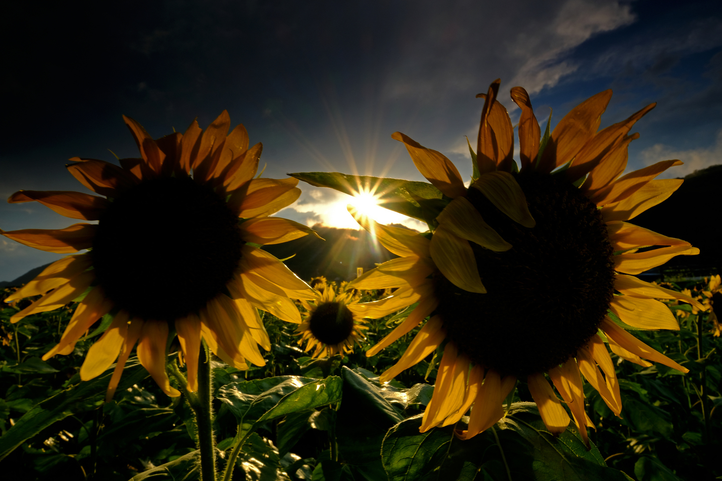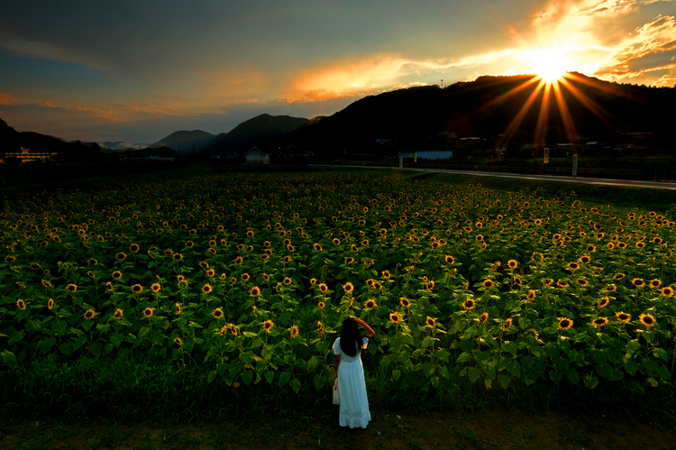 兵庫県西部にある関西を代表するひまわり畑です。午後に嵐のような雨が降り夕方は撮影できないと諦めかけていたのですが、最後に太陽が顔を出してくれました。おかげで誰もいないひまわり畑を独占して撮影することができました。空の白とびを抑えるためにハーフNDフィルターを使用しました。