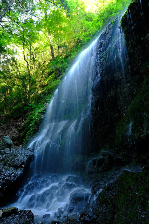 ひまわり畑から近いところにある高さ20mの滝です。滝はなるべく近くでダイナミックに撮りたいものです。広角レンズは横位置で使いがちですが縦位置にすることでイメージががらりと変わることがあります。