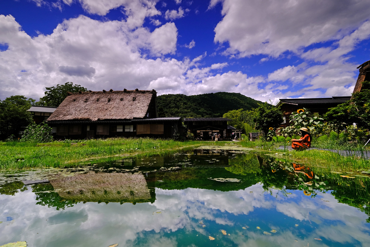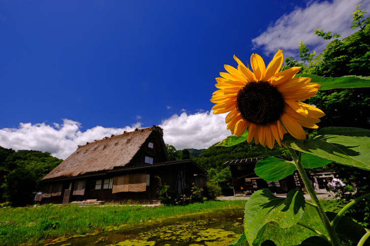 合掌造りで有名な白川郷ですが四季折々の風景が楽しめる場所でもあります。花が咲き青空とのコントラスがきれいな8月に訪れました。暑さのためか、ひまわりも元気なさげでしたが一本綺麗に咲いていたのでぐっと近づいて撮影しました。かなり近づいても背景を広く入れることができるのもこのレンズの特徴です。
