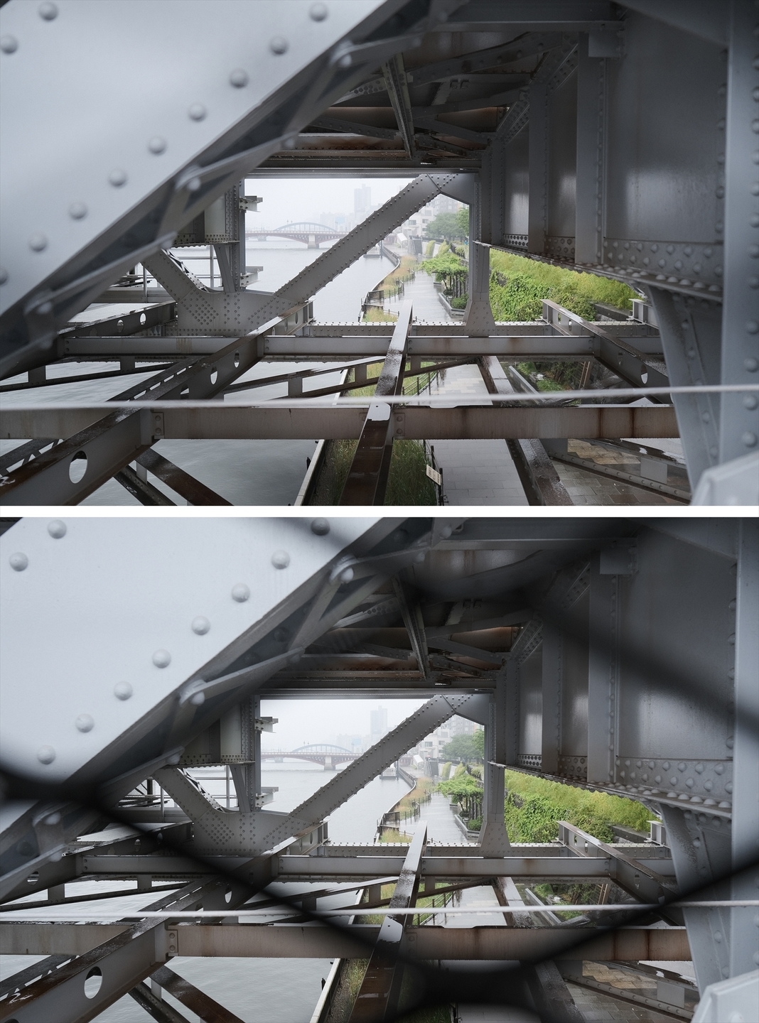 橋梁下からフェンスをのぞき込んで遠方の橋を撮影したところ、レンズ前にあるはずの金網が溶けて見えなくなってしまいました。また、遠方の橋にいたっては雨降りのどんよりとした空にもかかわらず、しっかりと写し込まれているのがわかります。