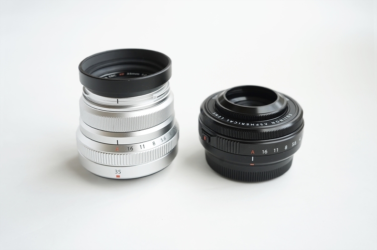 手持ちのXF35mm F2 R WR(左)とXF27mmF2.8 R WR(右)を比較してみました。コンパクトだと思っていたXF35mm F2 R WRが大きく見えてしまうほどXF27mmF2.8 R WRは薄くて小さいことに驚きます。