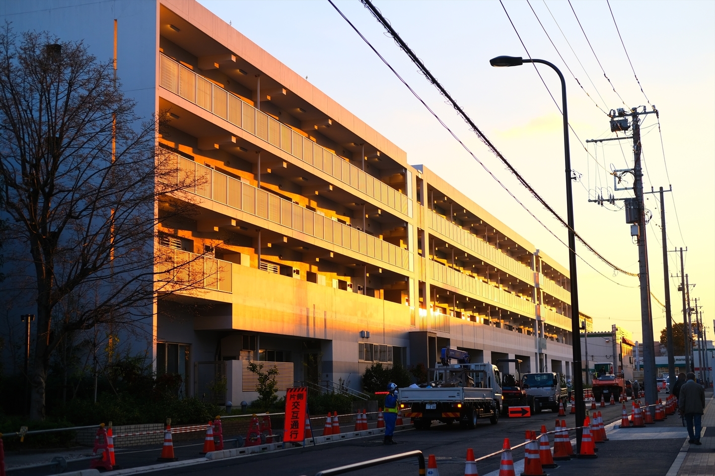 夕陽が差し込むマンションはアドバンストフィルター「Pop」で陽射しの鮮やかさを引き出してみました。画面奥に行くほど細くなる電線もしっかり映し込んでいます。