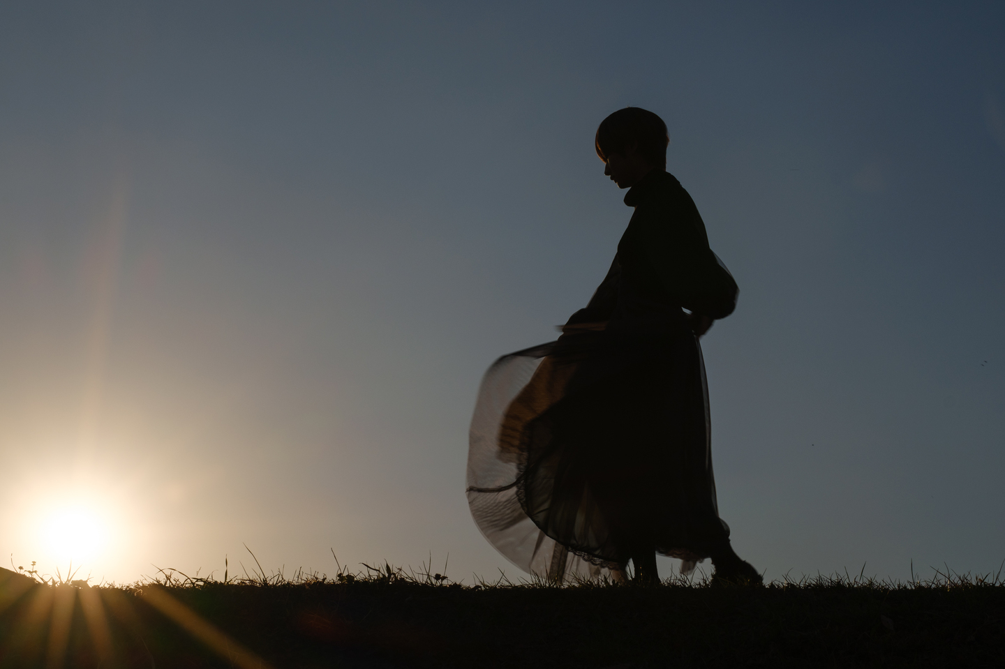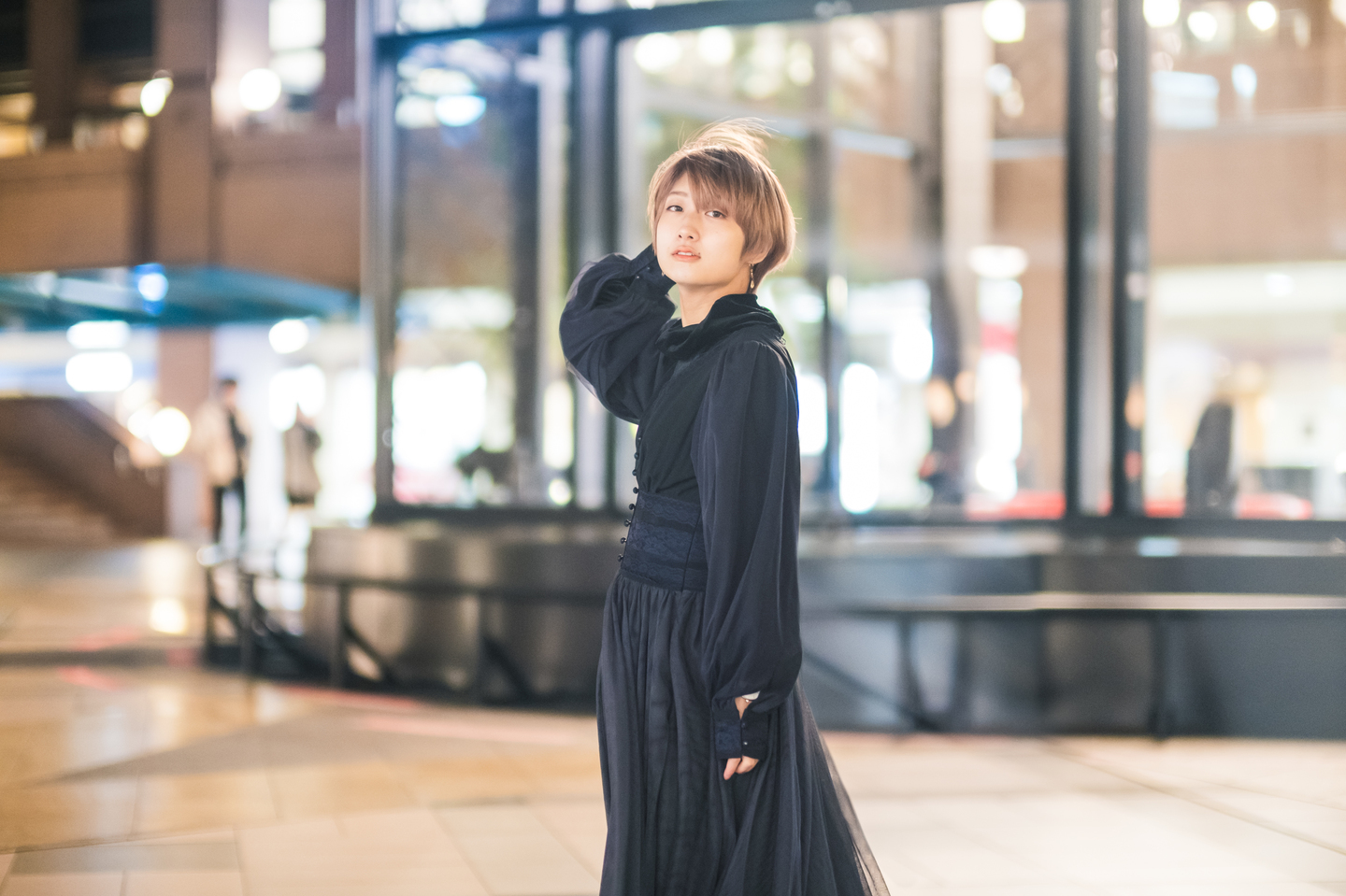たとえばこのカットは日没後モデルさんに適当に動き回ってもらい、その瞬間を切り取って撮影したものです。絞りを開放にしてISOを1250まで上げることで、1/75秒のシャッター速度を稼いでいます。通常なら周囲の暗さゆえに止まっているところを撮るしかないシチュエーションなのですが、このレンズなら実際に動いてもらってその瞬間の自然な表情や自然な動きを捉えることが可能になるのです。