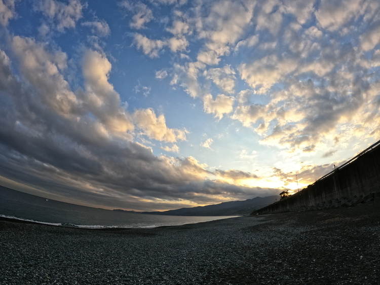 こちらは小田原の海岸での夕景だ。雲の立体感が素晴らしい。手前に拡がる砂利の高精細な写りにも驚きである。日没時の色再現もなかなかのものである。