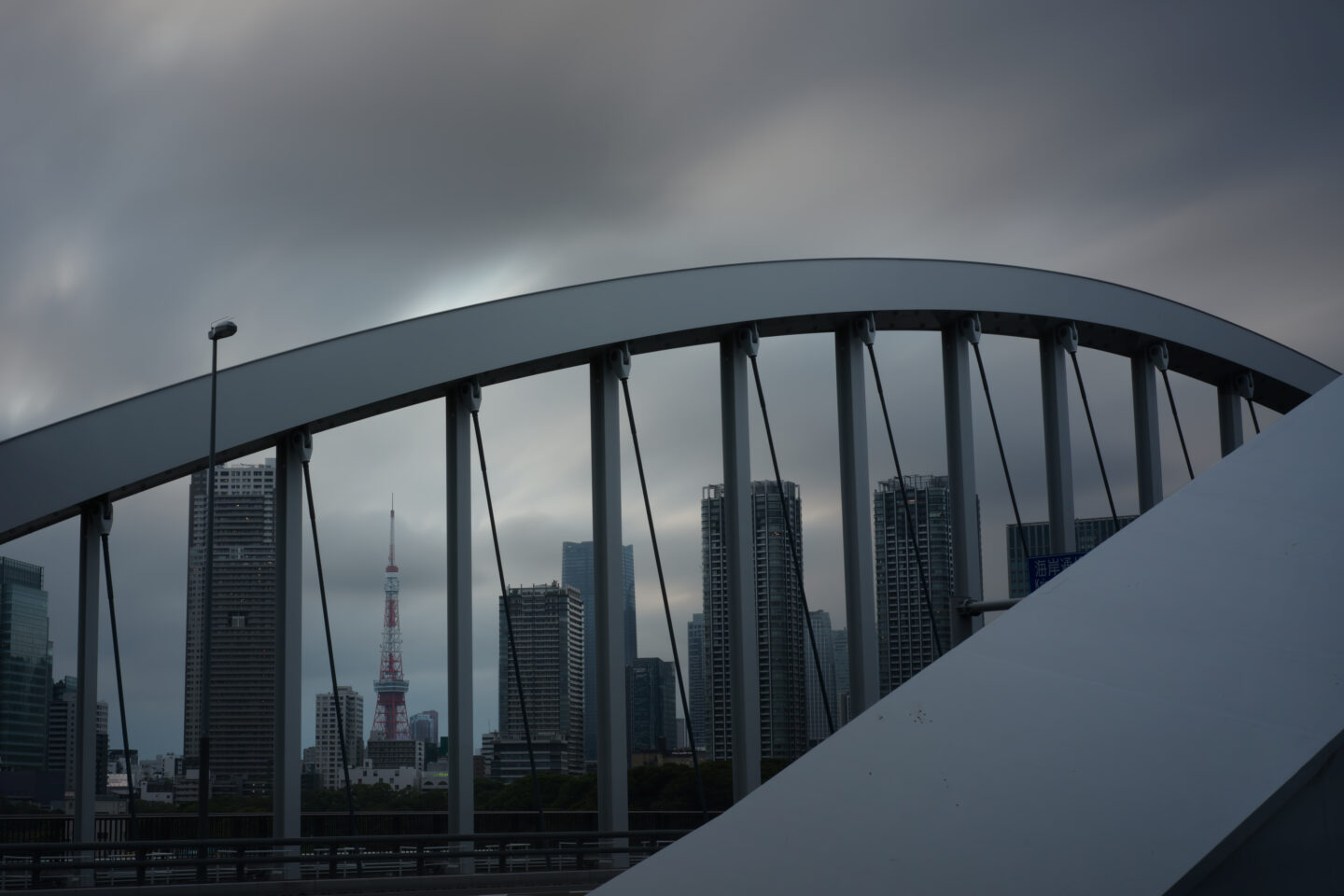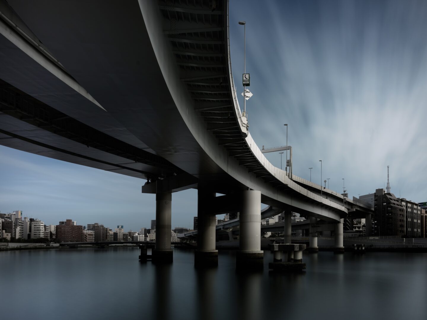 この写真は、都市の橋梁と背景の都市景観をテーマにしています。長時間露光により、滑らかな水面と静かに流れる雲が表現され、喧騒から離れた静寂が感じられます。全体のバランスのとれた階調と緻密なディテールが際立っています。