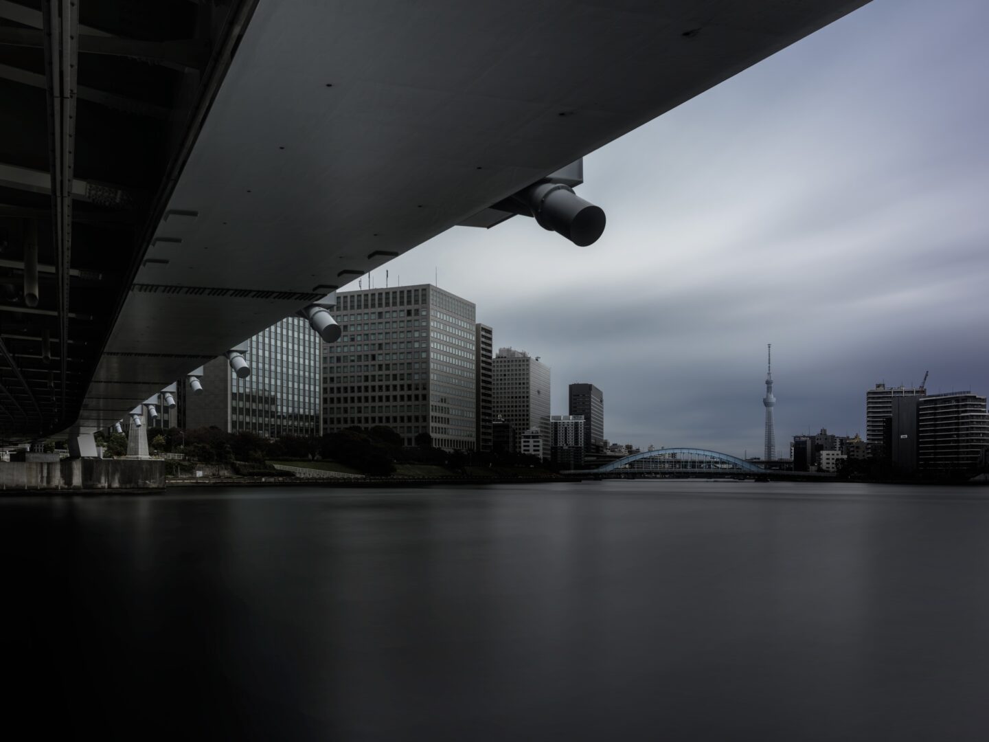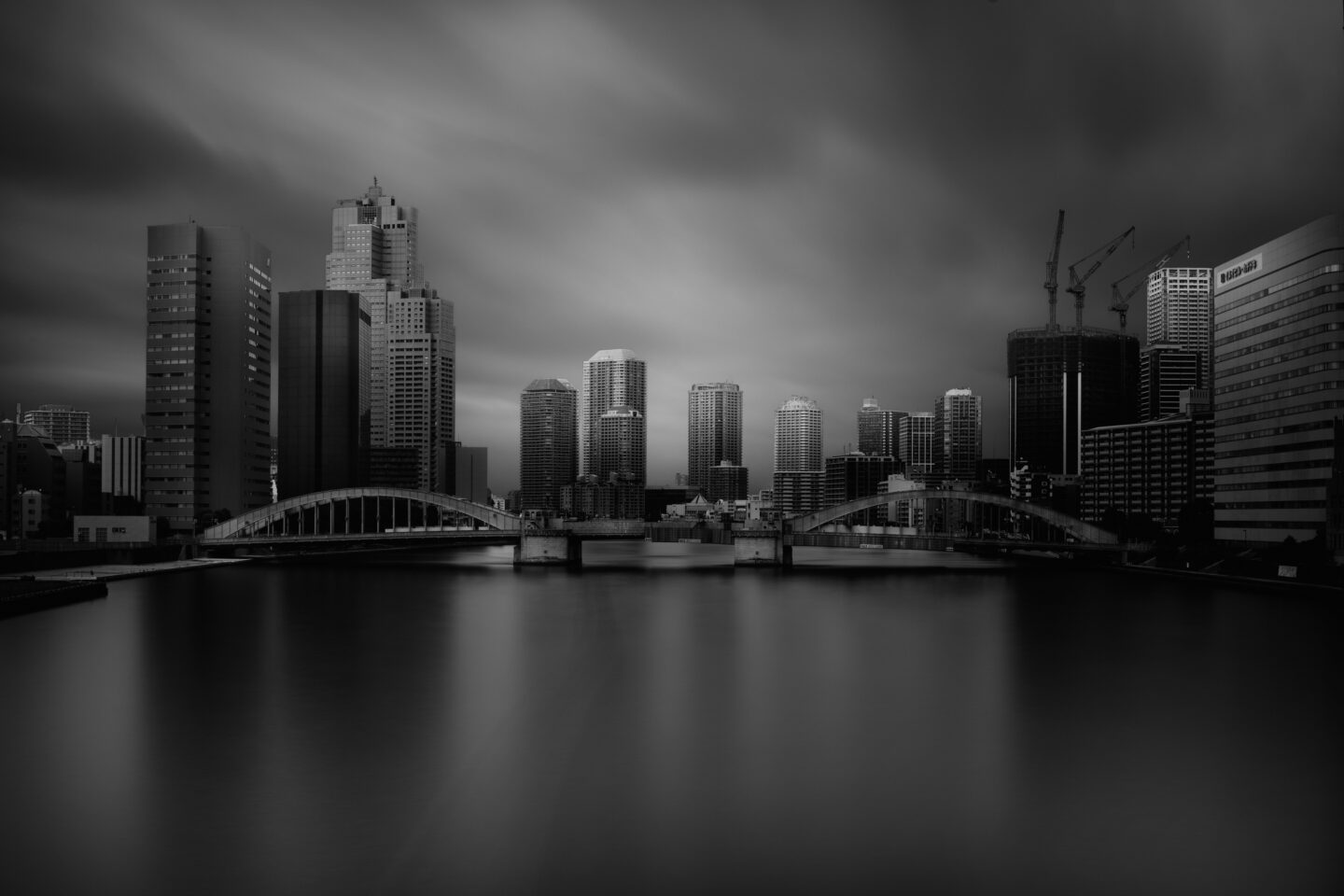 この写真は、都会のビル群と橋梁をモノクロームで表現した作品です。Hasselblad 907X & CFV 100Cの特徴を活かし、長時間露光によって水面は滑らかに、雲は柔らかく流れるように表現され、静謐でドラマティックな都市の風景が描き出されています。