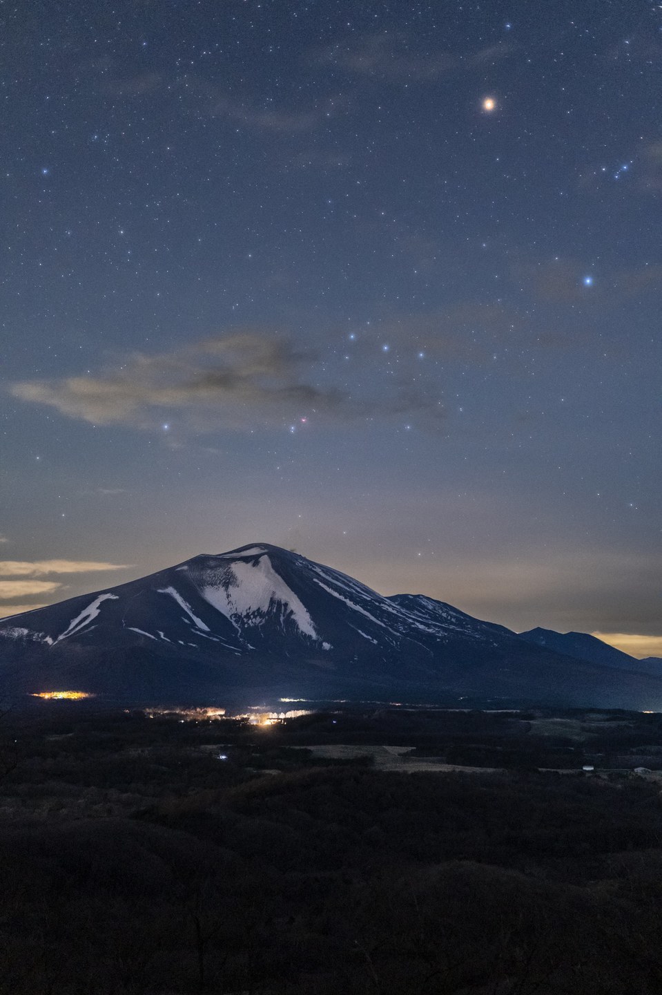 私がソフトフィルター使用時に好きな構図が、標準レンズ程度の画角で低い位置の星座と風景を収めること。焦点距離が長くなると速いシャッタースピードで撮影することができ、周辺部の星の形が歪むことも少ないです。圧縮効果で星座を大きく見せることができるのも撮影していて楽しいポイント。個人的にはハーフプロソフトンAはこんな撮影のときに最も効力を発揮する気がしています。この作例のように浅間山はシャープに、でも星しっかりとにじんで、きらびやかな星座感を演出することができています。