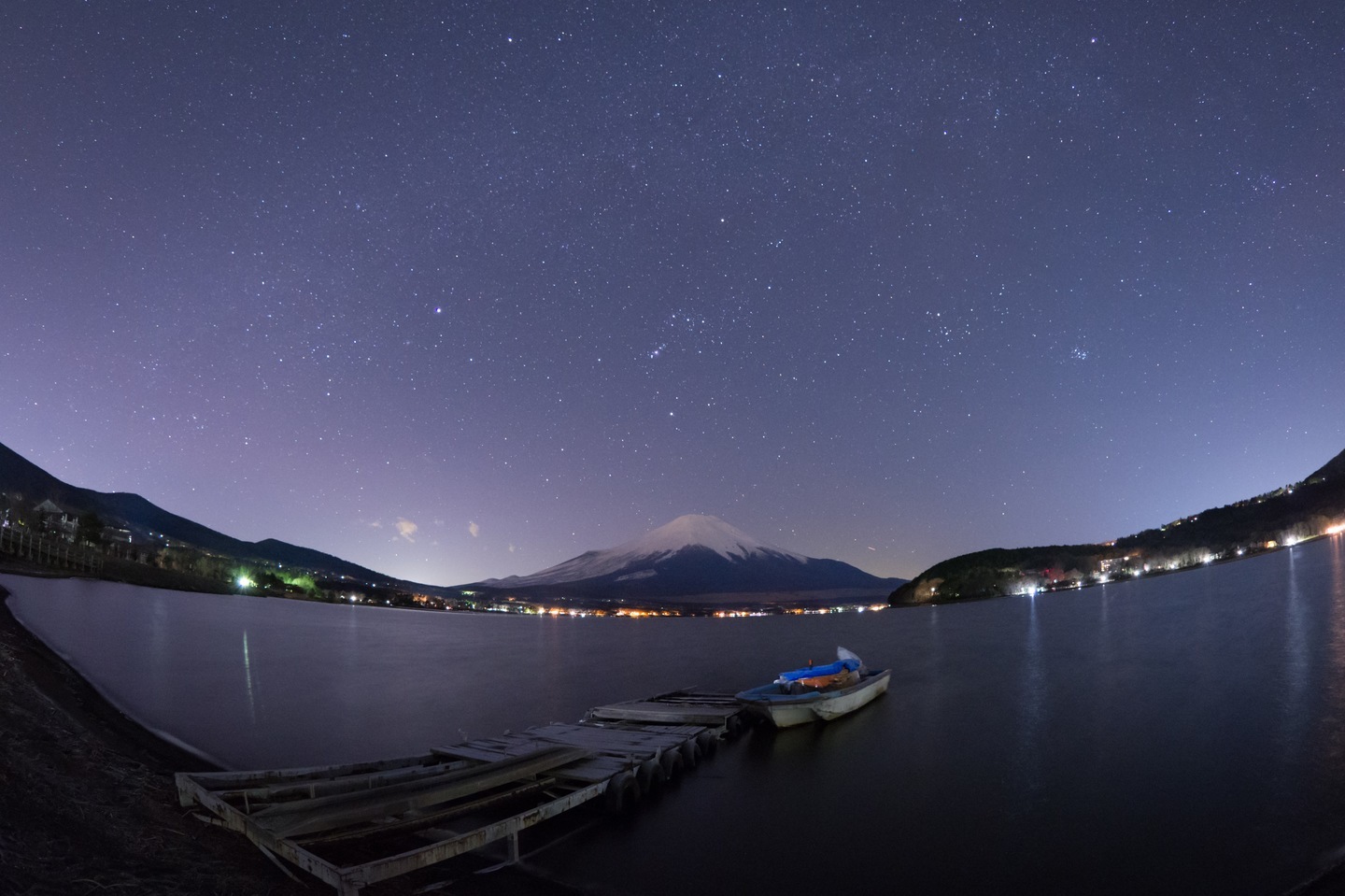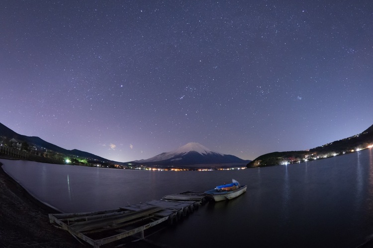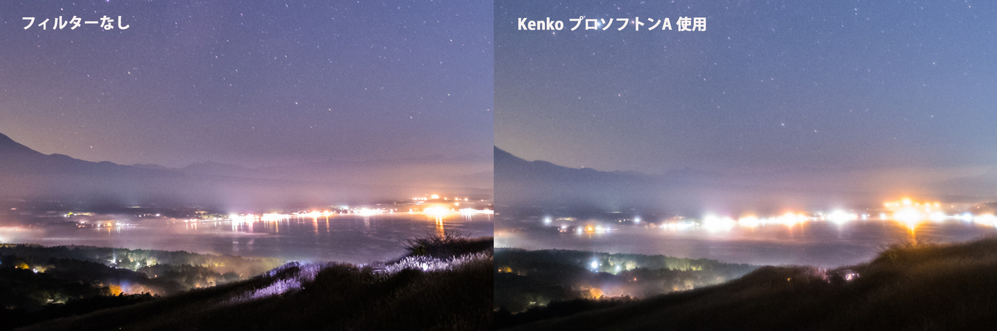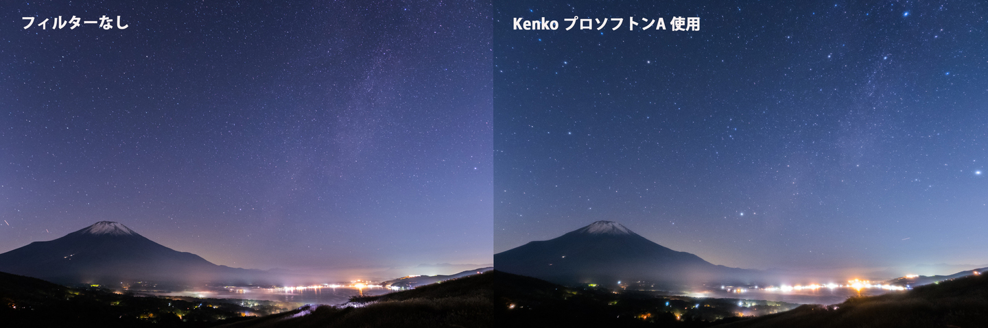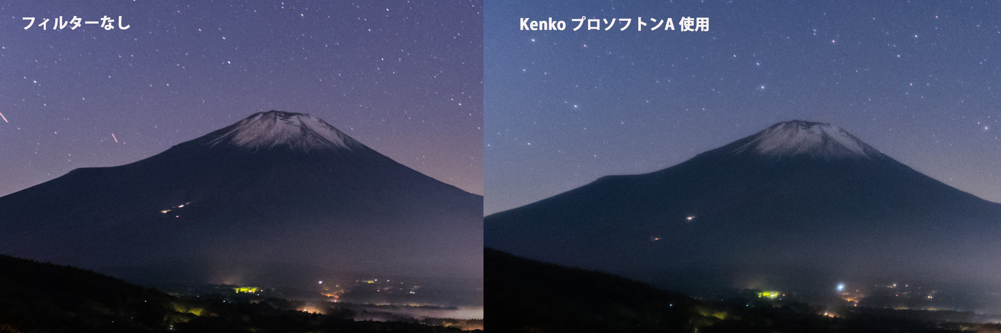 反面、ソフトフィルター使用時のデメリットもあります。下の画像を見てみましょう。Kenko PRO1D プロソフトンA(W)を使用しています。星は大きく滲んだものの、明るい夜景の光も大きく滲んでちょっとうるさい感じになってしまいました。また、富士山の稜線もソフトがかってぼやけてしまっています。星にはソフトフィルターが効果的ですが、こうした明るい夜景や街灯には不向きであり、風景部分のシャープさを保てなくなってしまうことがわかります。