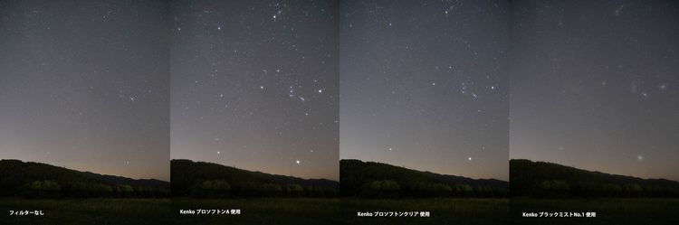 まずは円形フィルター3種を試してみます。それぞれ星がにじんでいますが、この時点でブラックミストは星景写真には不向きと言えそうです。輪郭を残しつつふわっとさせるというか、同じソフトフィルターでもだいぶ効果が違うものですね。ブラックミストは動画撮影などで人気のある素晴らしいフィルターで(実は私も愛用しています)、ユーザーから星で使えますか?という質問が多かったのですが、今回の結果を見ると星景写真ならプロソフトンAやプロソフトンクリアを選んだ方が良さそうです。