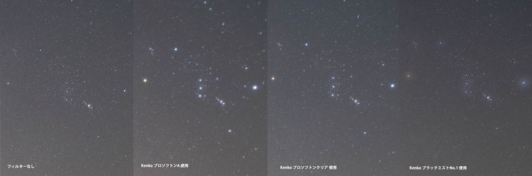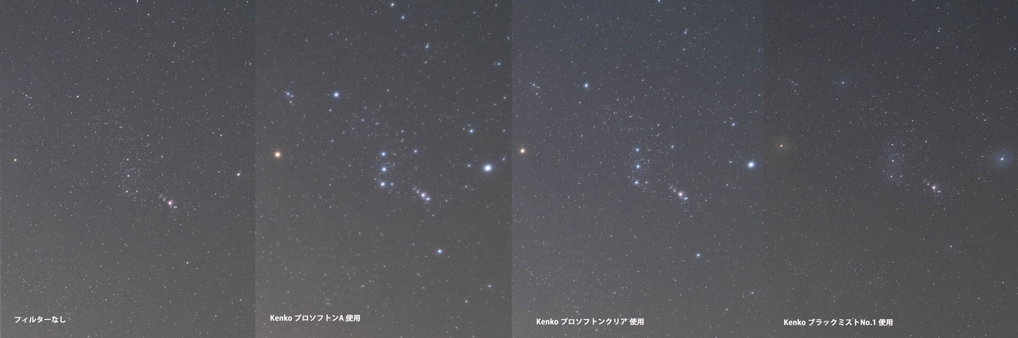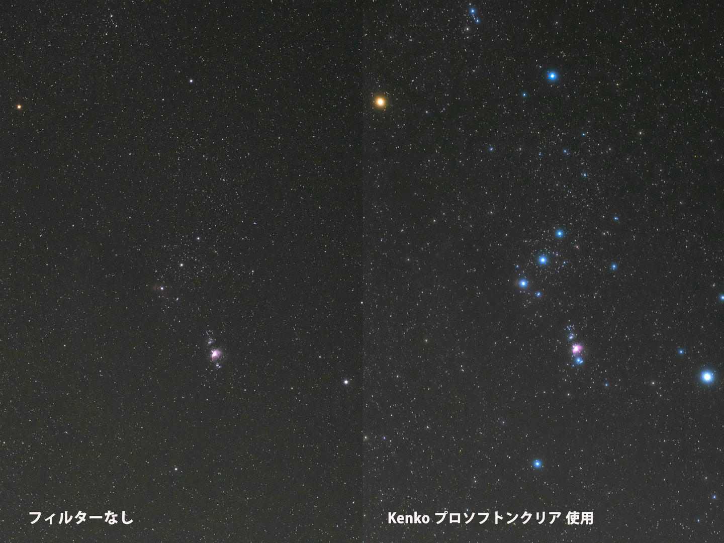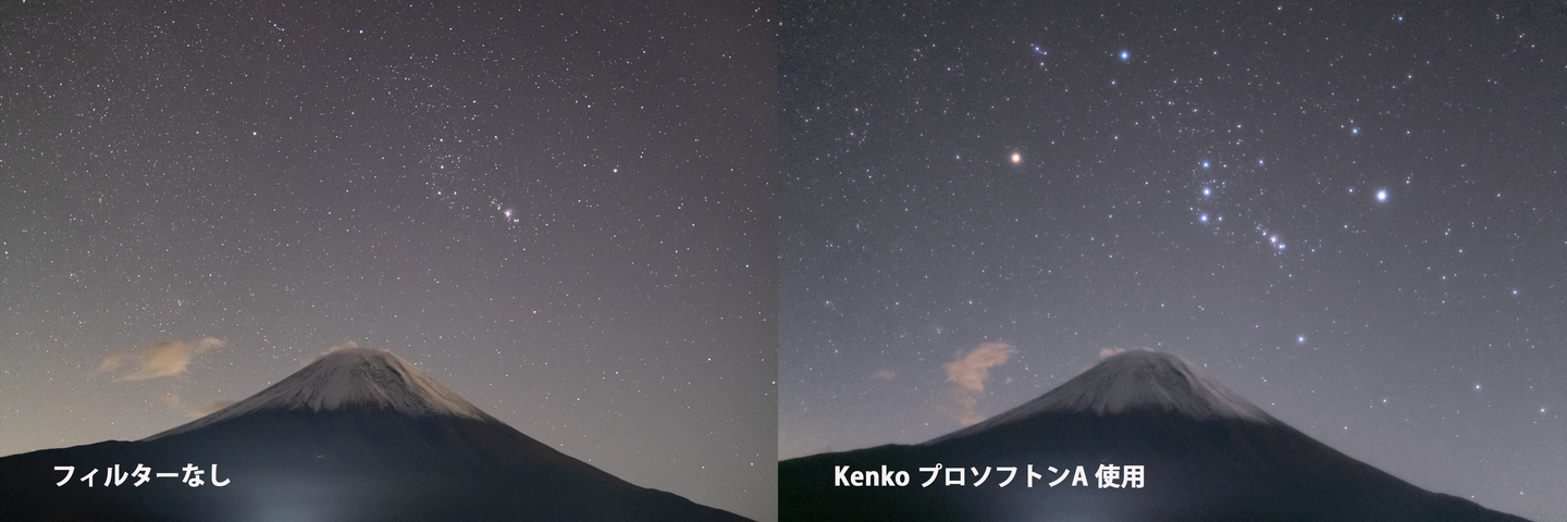 冬の星空の特徴は、1等星と呼ばれる明るい星が多いということ。そして、青や黄色など星の色が複数存在することです。また、すばるやオリオン大星雲など、大きな星雲・星団があるのも特徴です。下の画像を見てみましょう。Kenkoのソフトフィルター「PRO1D プロソフトンA(W)」の使用あり・なしの作例です。星が大きく滲んでいるのがわかります。それによって「星座感」が出て、オリオン座などの形がわかりやすくなっていますね。これがソフトフィルターの効果です。