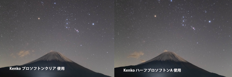 今度は風景部分のソフト感も検証したいと思います。富士山とオリオン座の構図を狙ってみました。フィルターなしだとやはり星座感がなく主題が曖昧な感じになりますね。それではソフトフィルター使用時の比較をしてみましょう。今回はハーフプロソフトンも使用してみました。