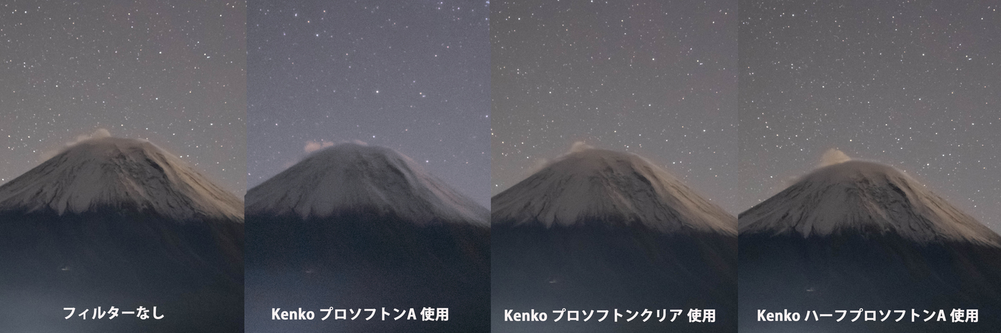 このような構図だと、星のにじみ加減よりも風景部分(富士山)の描写が気になりますね。プロソフトンAは風景部分の描写がかなり甘くなります。プロソフトンクリアだとそれが弱まります。ハーフプロソフトンはさすが風景部分はきっちりとシャープに撮影できていますね。プロソフトンAだと富士山がにじみすぎ、プロソフトンクリアだとまだ妥協できる、という感じでしょうか。