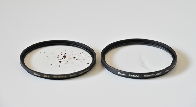 少し上方から見たカットです。「撥水・撥油コート」の効果がよく分かりますね。このあとブロワーで両方のフィルターを吹いたところ、PRO1D plus プロテクターは水分が広がったまま残ってしまい、クロスで拭き取ってもなかなか乾きませんでした。しかし、ZXII プロテクターの方はブロワーでほとんどの水分が吹き飛び、クロスで軽く拭くだけでフィルター面が乾いた状態となりました。雨天時の撮影でこれは頼りになるな、と感じました。