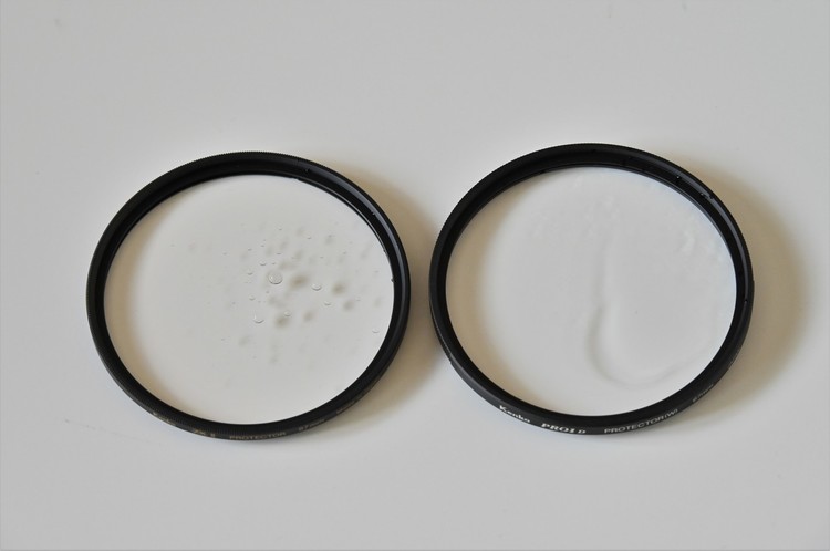 フィルターに霧吹きで水を吹きかけてみました。左が「ZXII プロテクター」、右は「PRO1D plus プロテクター」です。ZXII プロテクターの方は撥水・撥油コートに弾かれて水滴状になっていますが、PRO1D plus プロテクターでは水が滲んでフィルターの面に広がってしまっています。