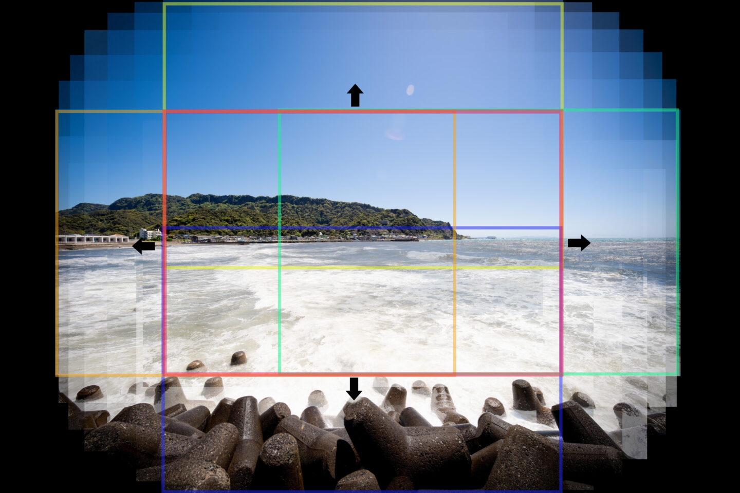 カメラを三脚に固定した状態で、シフト位置により写る範囲の変化がわかるように、最大シフト量にしたレンズの位置を15°ごとに360°軸回転させながら撮影した画像を重ね合わせた。中央部の赤枠がシフト量ゼロの撮影画像位置。レンズを上に最大シフトすると黄枠、下に最大シフトすると青枠、右に最大シフトすると緑枠、左に最大シフトするとオレンジ枠の範囲が撮影される。