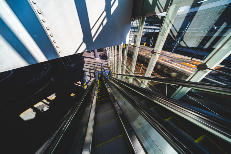 超広角のパース効果でただのエスカレーターもどことなくSFチックに見える。