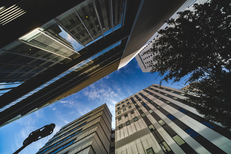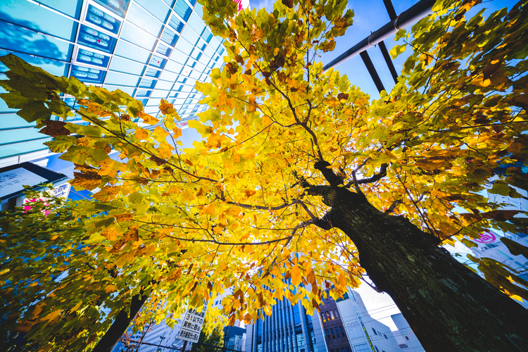 街路樹と街並みを一枚で。超広角の歪みを生かして画面に動きを出すことも。