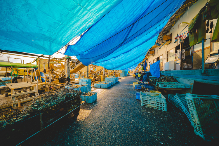 牡蠣の加工施設を撮影。天井のブルーシートが印象的。