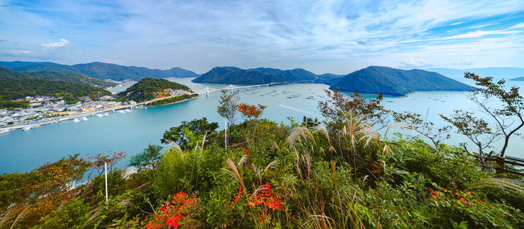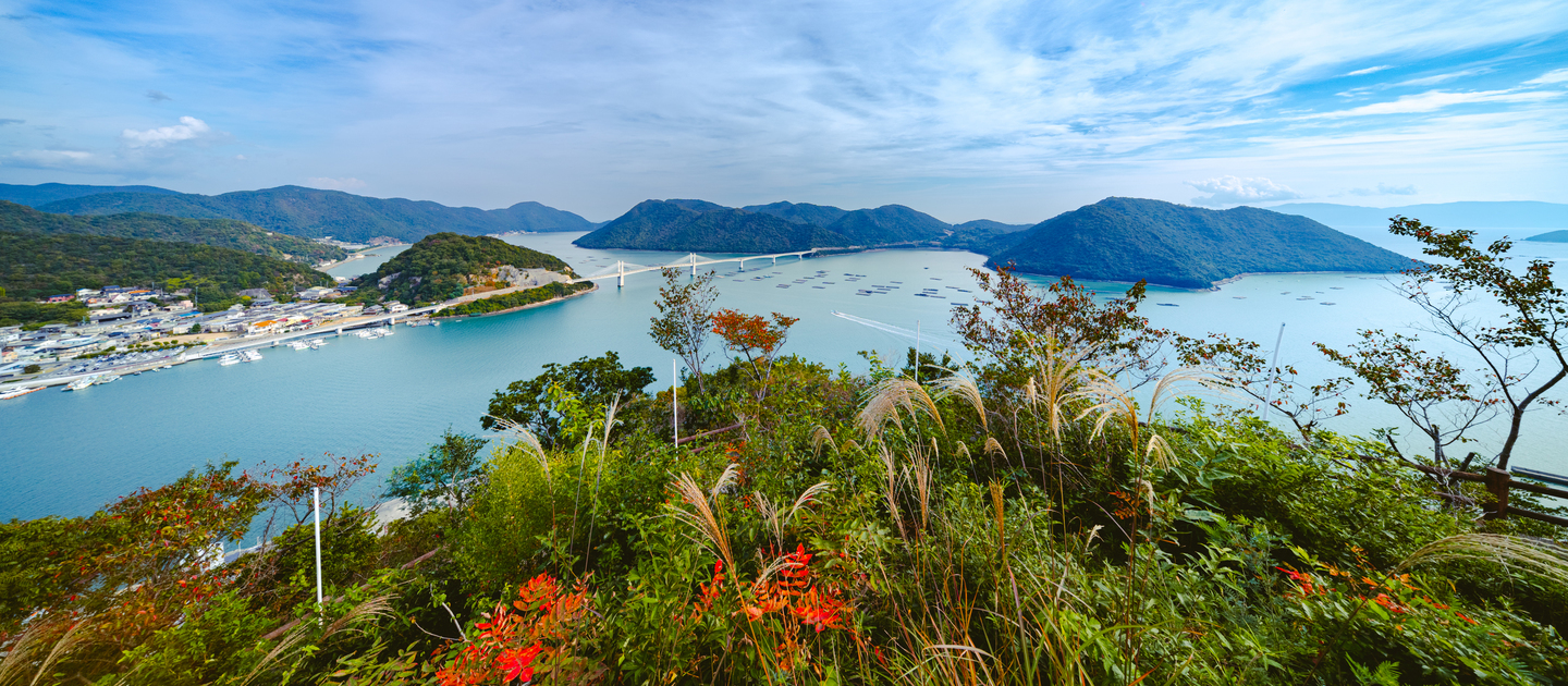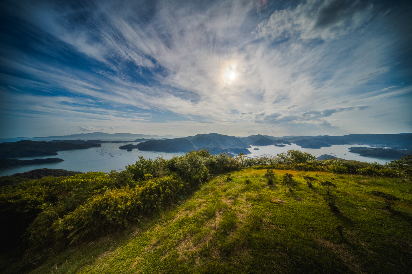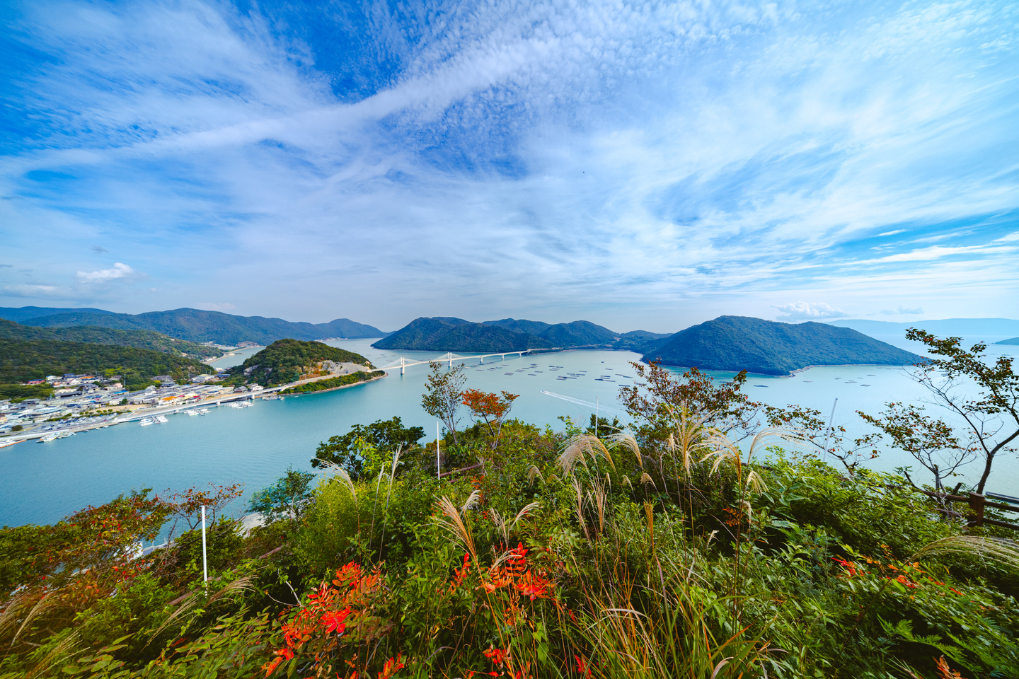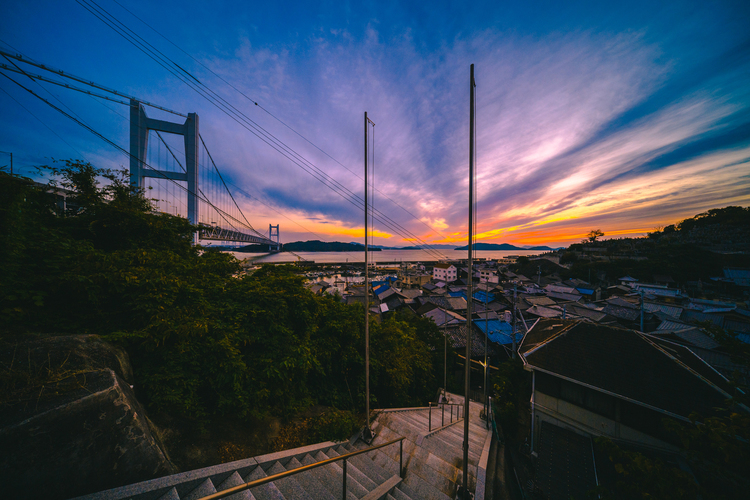 瀬戸大橋のある夕景。画角が広すぎて非現実的な一枚に感じる。