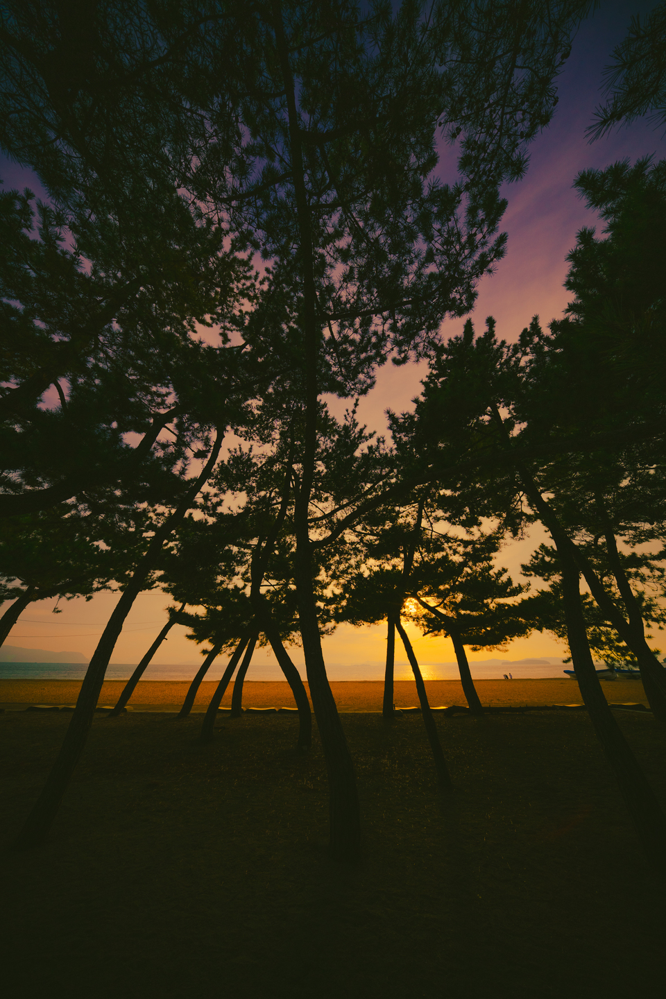 夕焼けのグラデーションを松林のシルエット越しに撮影。