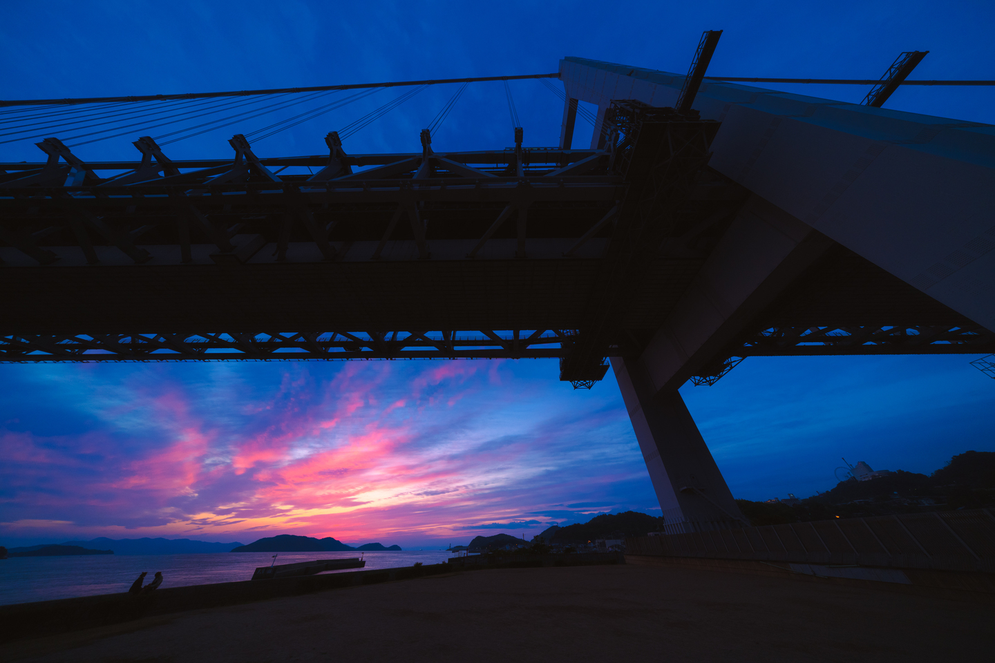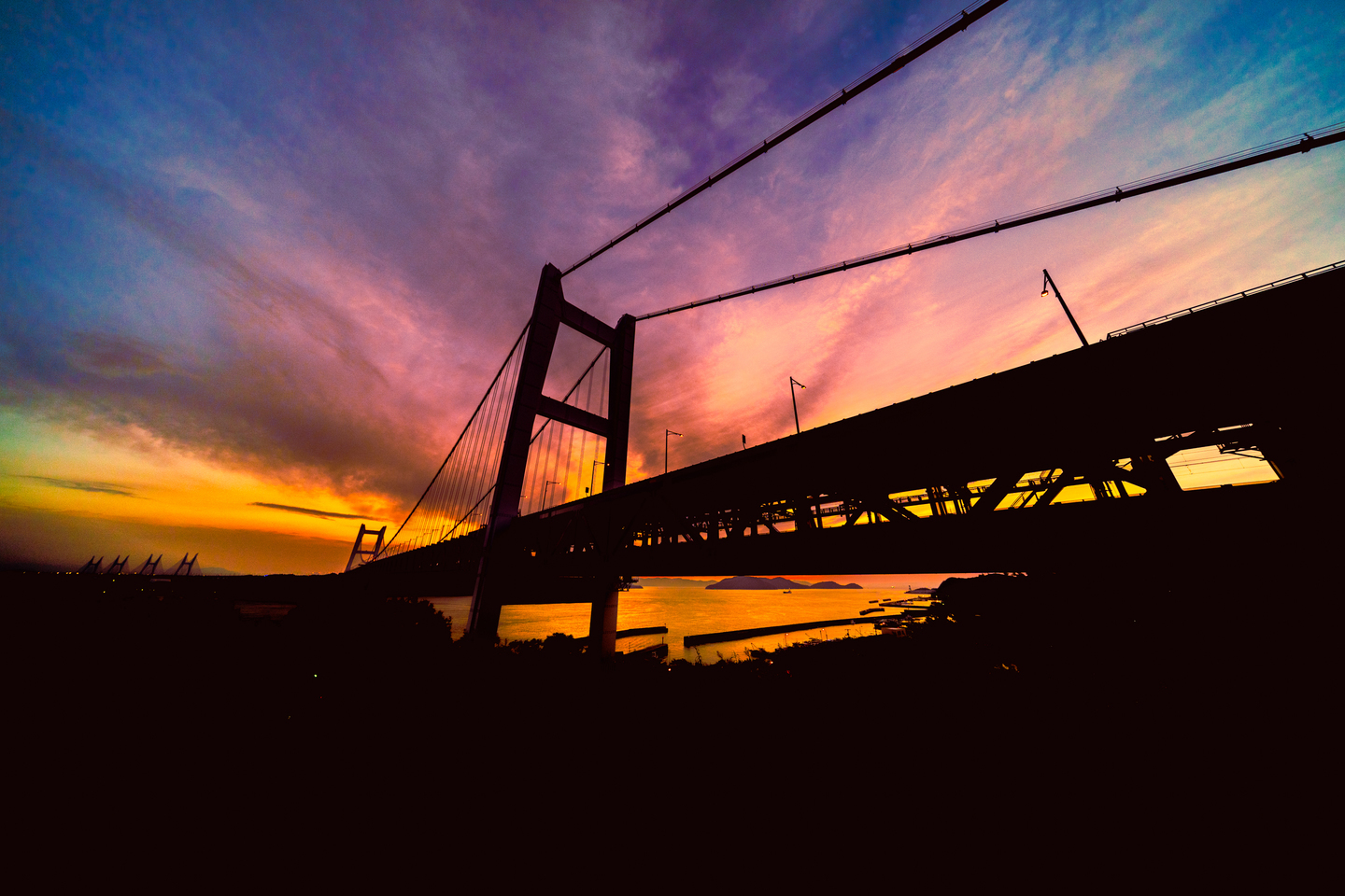 夕焼けを背景に瀬戸大橋をシルエットにして撮影。