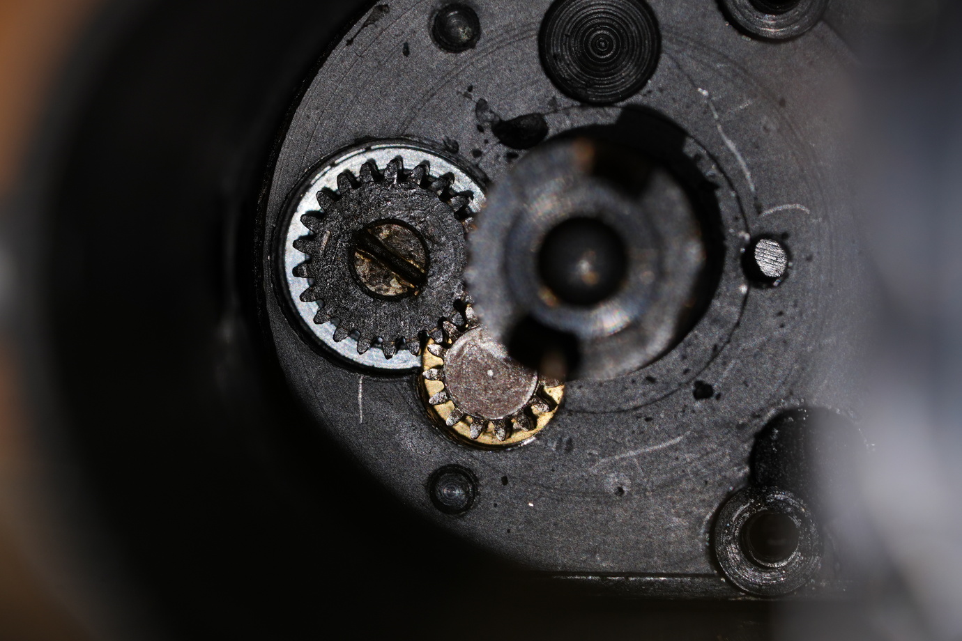 底蓋を外して、ライカM3プロトタイプのフィルム巻き戻し軸の部分に光を当てて撮影したのがこの画像です。巻き戻し軸の9時位置にあるのが巻き戻しノブの軸に設けられたギアです。これが巻き戻し軸のギアと噛み合って回ります。バルナック型ライカではフィルム巻き戻し軸と巻き戻しノブは同軸のシンプルな構造でしたが、ライカM3プロトタイプではファインダーブロックが大型化したことから巻き戻し軸をトッププレートまで貫通させることができず、巻き戻しノブをオフセットする必要があったと思われます。でも、こうすると2つのギアの回転方向が逆になるので巻き戻しノブを反時計回りに操作しなければならなくなったということですね。