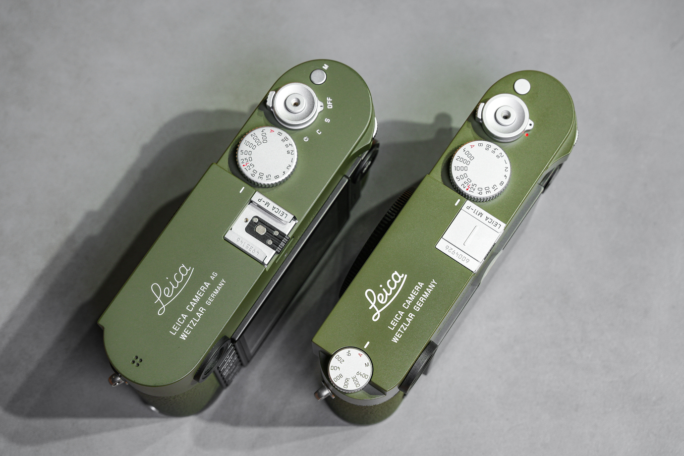 私の記憶が正しければ、ライカ製品に“サファリ”という名称が付いたのは絞り優先AEを搭載したフィルム一眼レフの限定モデル、ライカR3サファリが最初で1978年の発売でした。ライカM8.2以降のデジタル機に採用されているオリーブ色とは多少異なり、ライカR3サファリのボディおよび交換レンズの色は明度が低い濃い緑色でした。上の写真は、ライカM-PサファリとライカM11-Pサファリ。この色について中明さんにコメントを求めると
