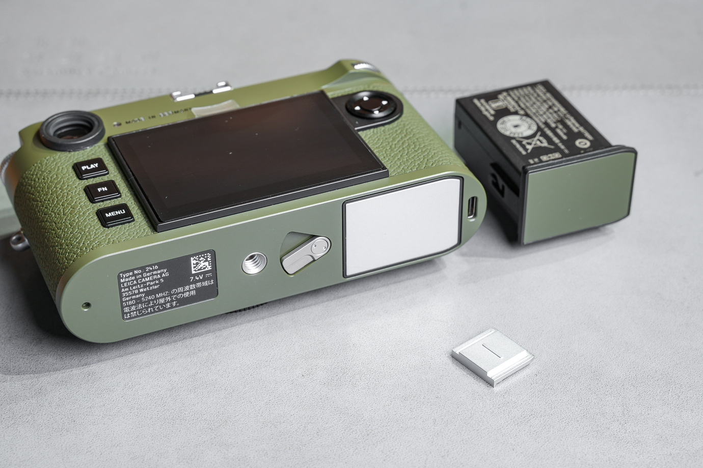 ライカM11からは底蓋を外してからバッテリーを取り出す方式ではなくなったので、バッテリーの底部は剥き出しの仕様です。だから露出する部分にはオリーブの塗装がしてあります。ライカM11用であれば色に関係なく互換性があるので、シルバーのバッテリーを装着することも可能。アクセサリーシューカバーやバッテリーロック解除キーもシルバーなので、見た目の違和感もなく使えると思いますし、予備のバッテリーを2本用意するなら色違いだと区別しやすいですね。中明さんによると、お客さんで実際にシルバーのバッテリーを使われている方もいらっしゃるとのことでした。