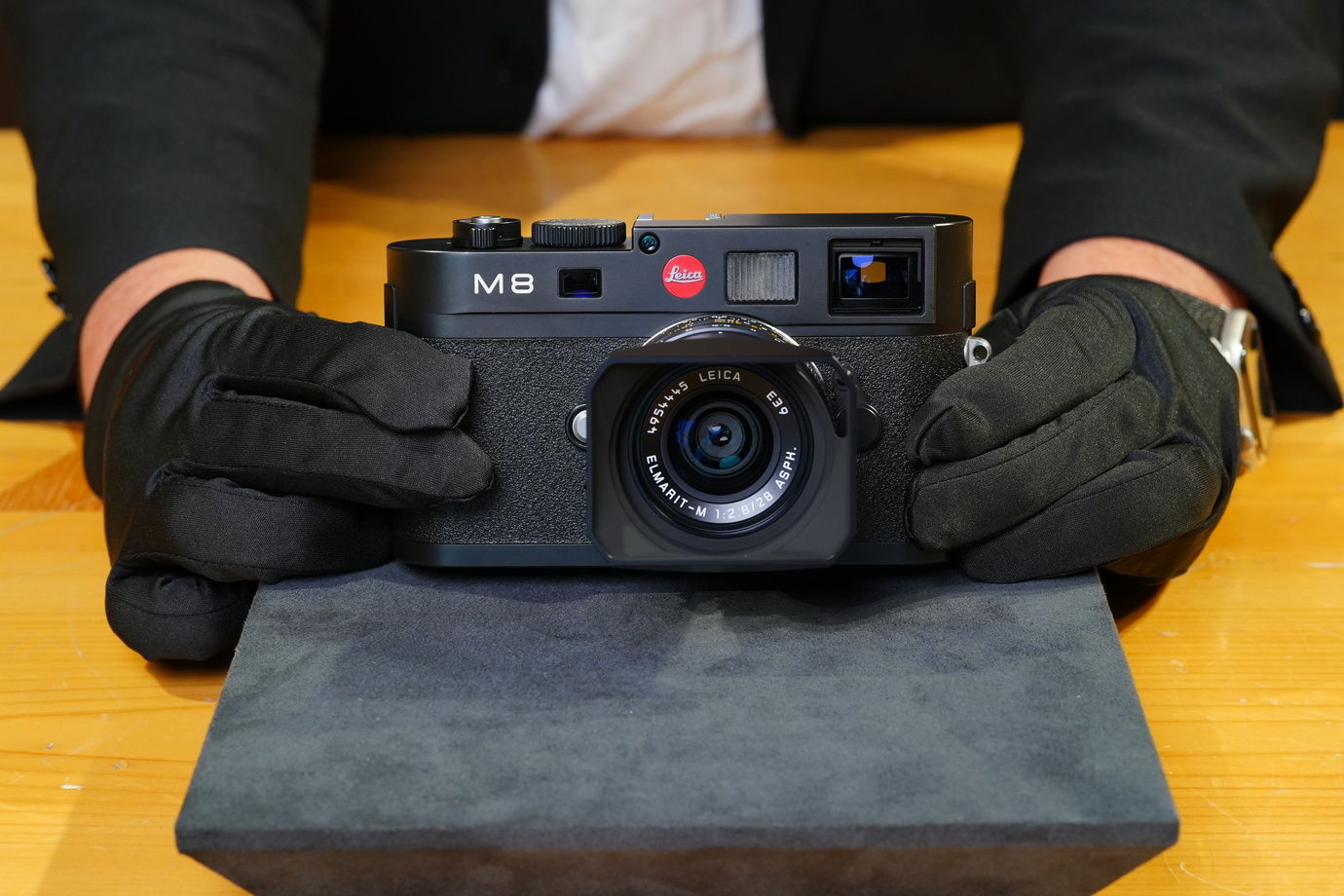 「見た目の部分から大きな違いがありまして、M8はブラッククローム仕上げですが、M8.2はみなさん大好きなブラックペイント仕上げです。たぶん通常モデルではかなり珍しいと思うのですがライカの赤いロゴが最初から黒いのが大きな特徴です。今回ご用意したものは現行の革に張り替えてありますが、本来M8.2はちょっとゴツゴツしたテクスチャーになっていました」そうですね、M8.2は黒くて渋好みの静かな雰囲気のカメラでした。