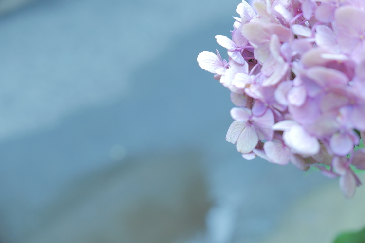 この時期アジサイをよく撮るけれど、その造形は本当に美しいなと思う。そして、最近こう思う。アジサイに青い色が多いのは、梅雨の時期はアジサイが青空の代わりだからなのかな、と。アジサイの花びらに大きな青い空を重ねながら、小雨の中撮影する。