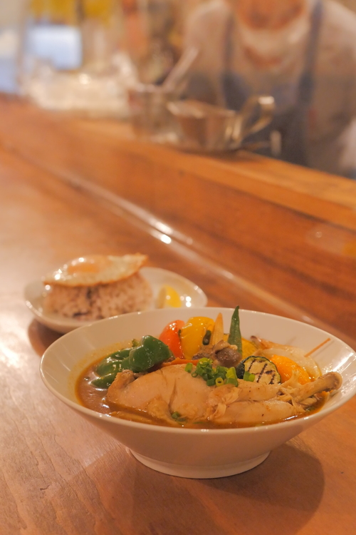 思わず声が出てしまう。何種類入っているのですかと聞くと、何種類ですかねえ14種類かなとにっこりと男性が答える。美しく美味しそうにそして丁寧に盛り付けられたカレー。カウンターに戻ってパキパキとスープカレーを作る男性を背景にパチリ。本当は「なんでケムリという名前なのですか」と聞きたかったけれど、お客さんが次から次へとやってきて、なかなか聞くタイミングがなくてそのままスープカレーをいただく。