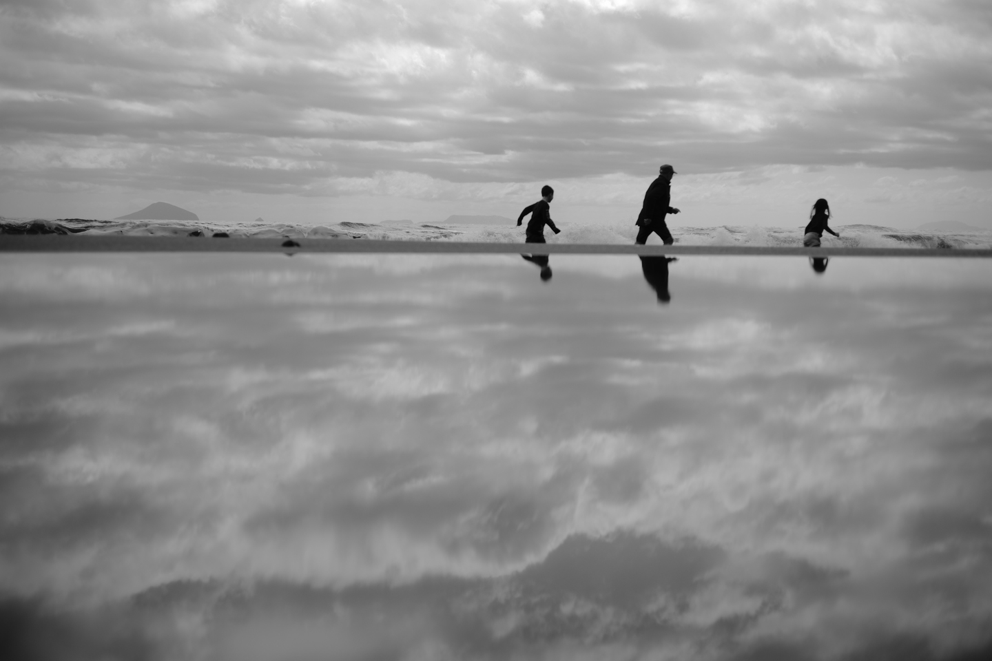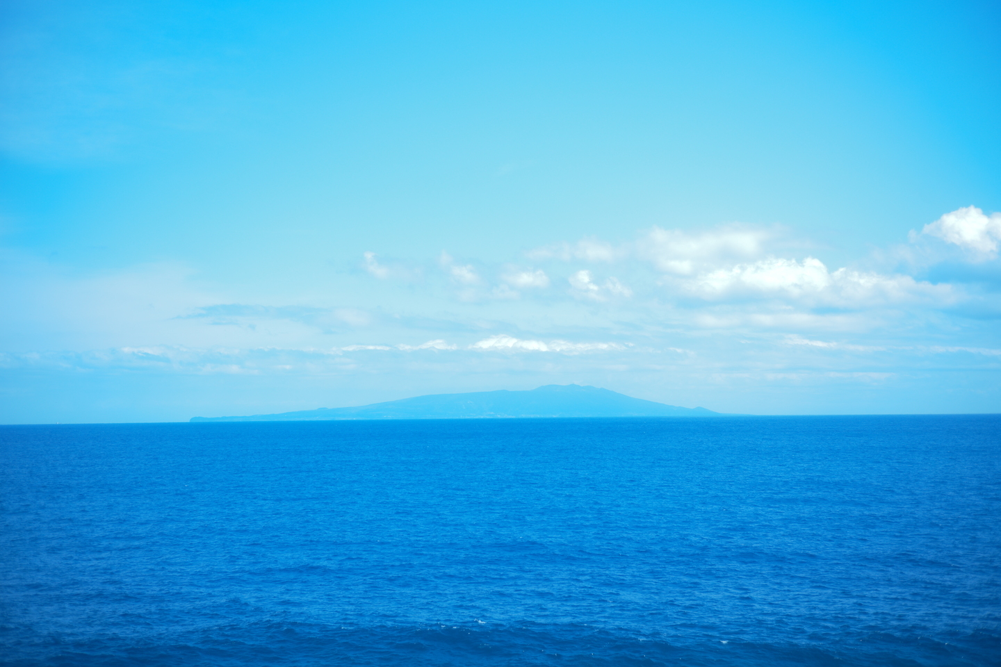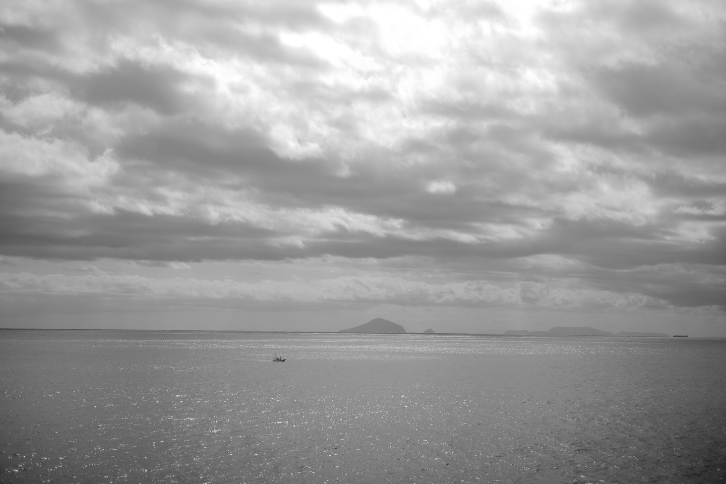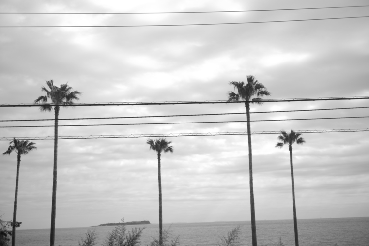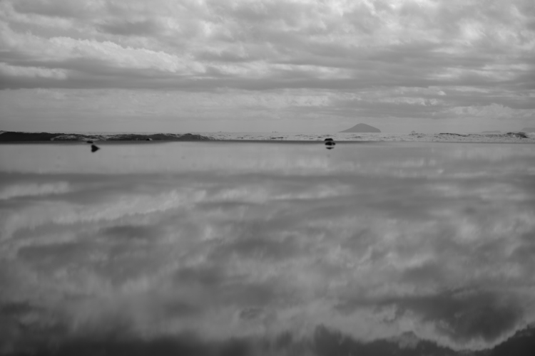 リフレクションで水溜まりに写ったぶ厚い空の雲は、線対称に上下に写っている。きれいだ。雲があって良かった。どよんとした雲が、この写真の主役だ。遠くに利島(としま)が見える。小さな二等辺三角形で真ん中にぽつんとかわいらしく写っていている。私、この写真好きだ。うん、好き。ライカを持って旅をして、初めてこの写真が好きだと思える写真が撮れた。ああ嬉しいなあ、そんなことを思いながら、再び同じ構図で撮っていると、どこからともなく人の声が聞こえる。