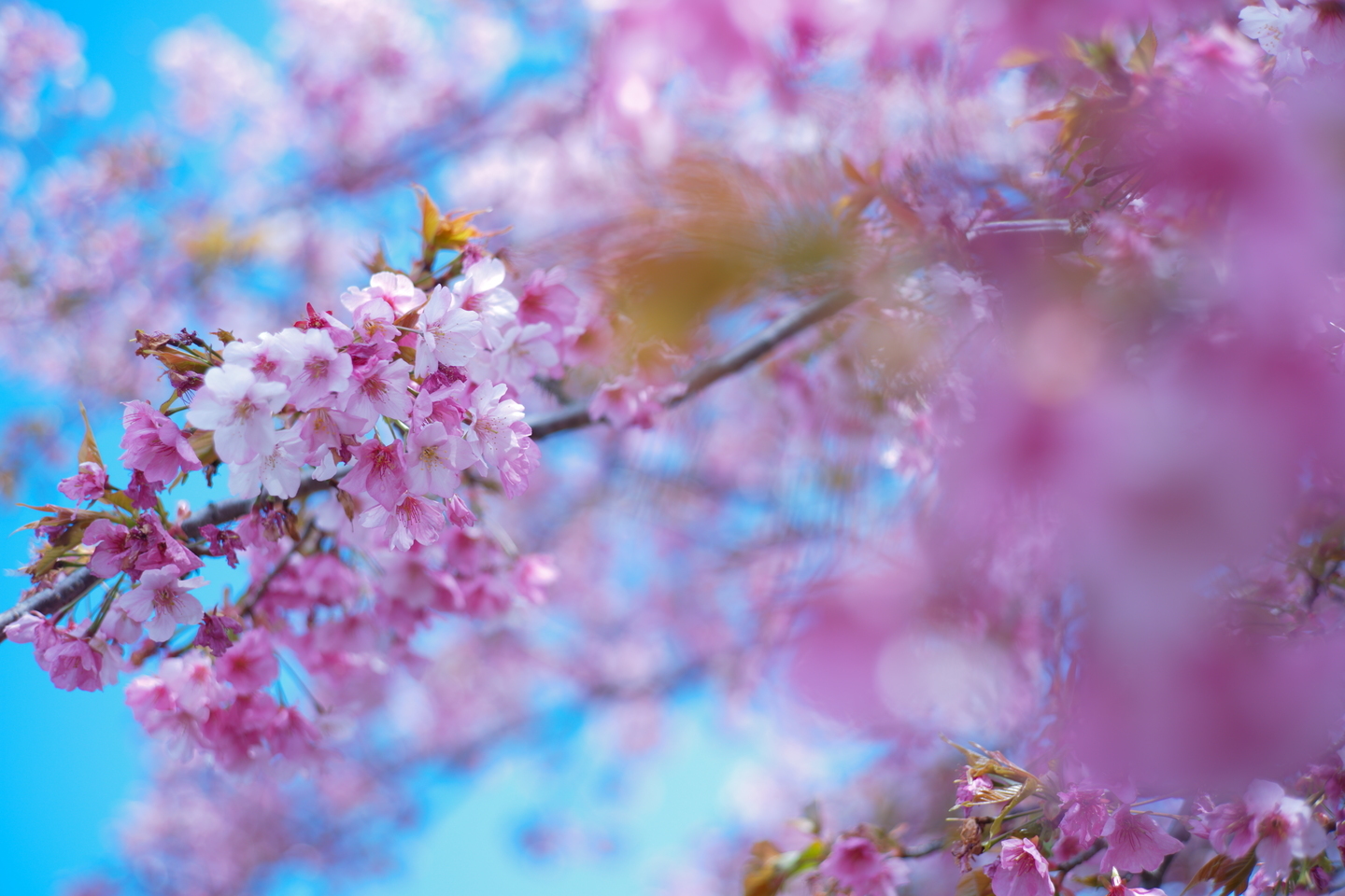 川沿いの歩道の脇にどんと立っている桜の木の下で、無我夢中になりながら私はシャッターを切った。ズマリットMf2.4/50mmの最短撮影距離は80cm。レンズに近い桜の花がトロリと美しい前ボケになる。たくさんシャッターを切っていたら、雲間から青空が見えてきた。そして、どんどん青が広がっていって最後には雲一つない青空になった。ウグイスが飛んできた。1羽、2羽。しばらくして青空の中に飛んで消えて行った。